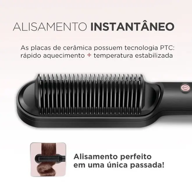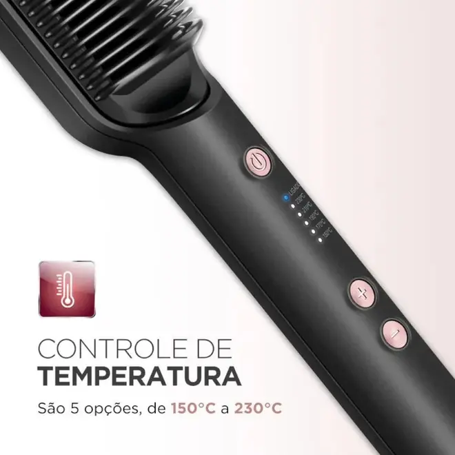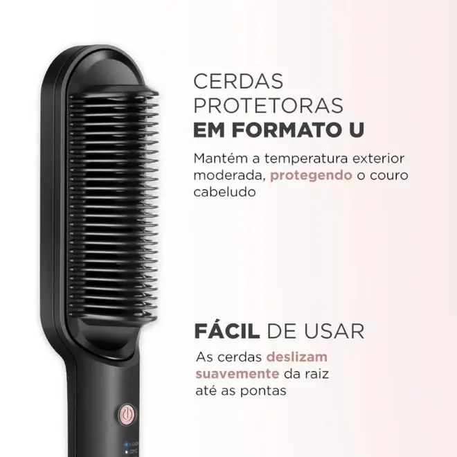 A Escova Alisadora EA-07 é projetada para oferecer facilidade e praticidade no uso, basta selecionar a temperatura desejada entre as 5 opções disponíveis, que variam de 150°C a 230°C, aguardar o aquecimento e deslizar a escova pelas mechas de cabelo, desde a raiz até as pontas. Com a capacidade de aquecer até 230°C, as placas de cerâmica proporcionam um alisamento eficaz, enquanto o formato das cerdas em “U” assegura que a temperatura exterior se mantenha moderada, oferecendo uma proteção adicional para o couro cabeludo.