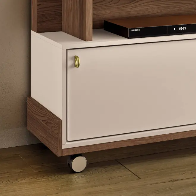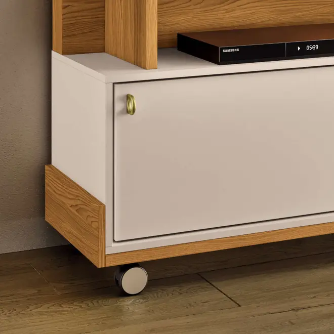 Além disso, para dar mais beleza e utilidade ao móvel, ele conta com detalhes ripados, 2 portas de correr com trilho em alumínio, puxadores em poliestireno com design exclusivo e acabamento na cor dourada e 1 prateleira com 25mm de espessura que suporta até 4kg.