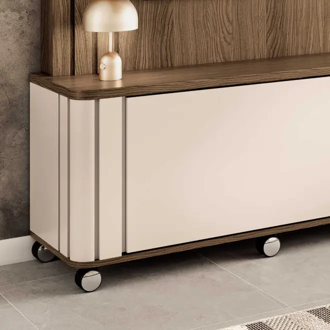 A Trinus não é apenas um móvel, é uma peça que agrega valor ao seu lar. Seu tampo e prateleira superior com espessura de 25mm garantem resistência e durabilidade, enquanto os cantos arredondados com detalhe ripado conferem um toque de requinte e suavidade à peça. A porta deslizante com trilho em alumínio é um dos destaques, proporcionando facilidade no uso e um acabamento único.