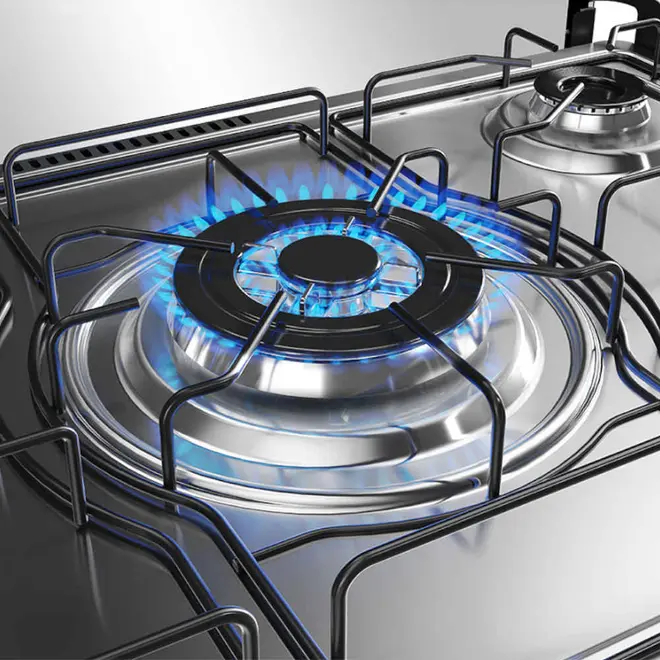 Com mesa em aço inox, o Fogão 5 Bocas Mueller MFI5BF garante durabilidade, limpeza fácil e um toque de sofisticação para a sua cozinha. A tampa de vidro temperado protege o fogão com segurança e ainda valoriza o visual do ambiente. Já o acendimento automático total traz mais comodidade, é só girar e acender, sem precisar de fósforos!