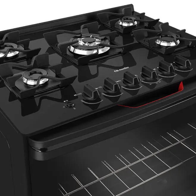 Fogão 5 Bocas Mueller MFV5BF com Mesa de Vidro e Tripla Chama Preto Fosco - Bivolt