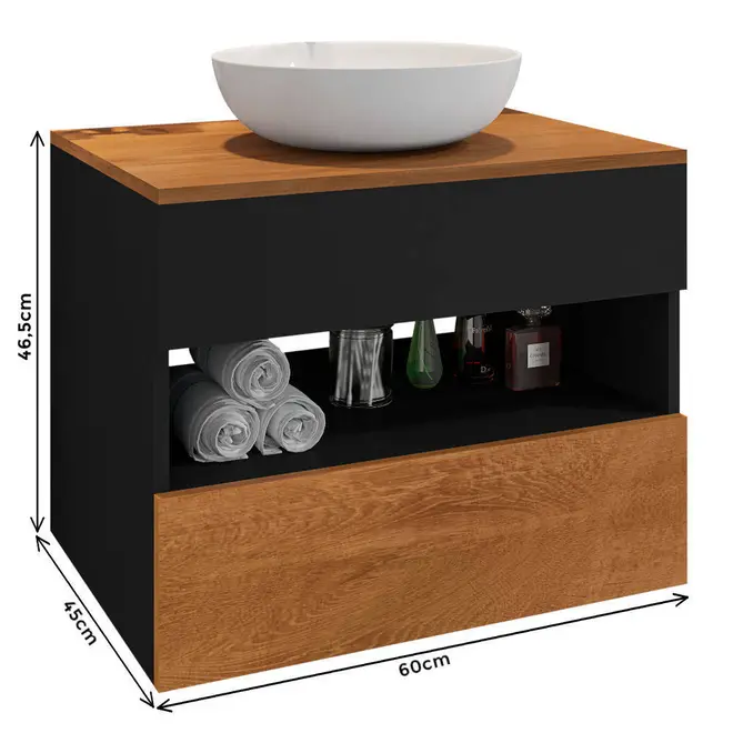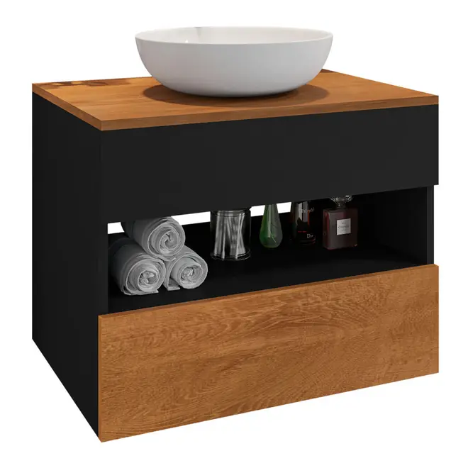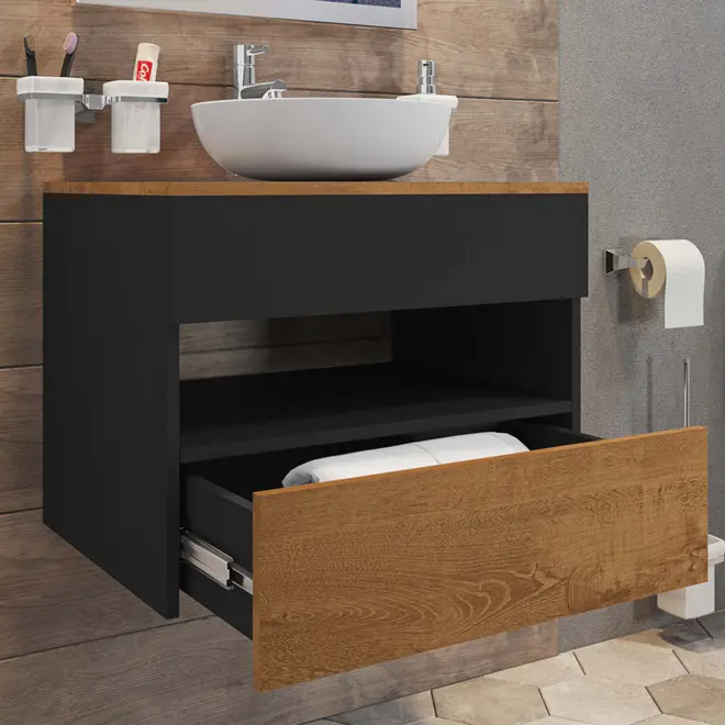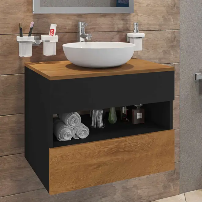 O Gabinete Bali foi desenvolvido para trazer ainda mais praticidade e funcionalidade para sua rotina, ele dispõe de 1 nicho, 1 gaveta com corrediças telescópicas além de um bom espaço interno que garante melhor armazenamento das suas coisas. Além disso, outro ponto positivo é a sua fabricação que é feita com chapas de MDP, material responsável por garantir com que o móvel tenha toda a firmeza e resistência necessária e para garantir maior qualidade ao produto a cuba é sobreposta e é feita em mármore sintético.