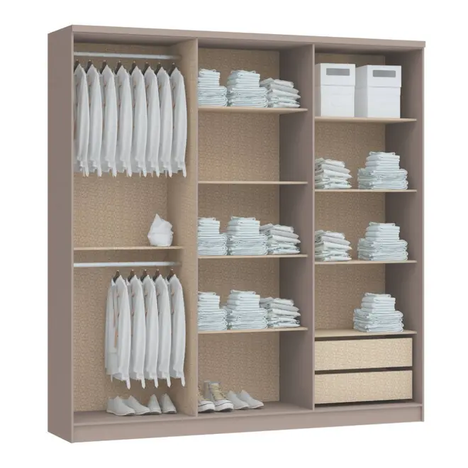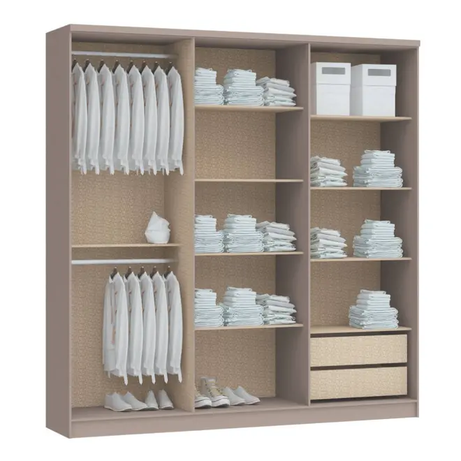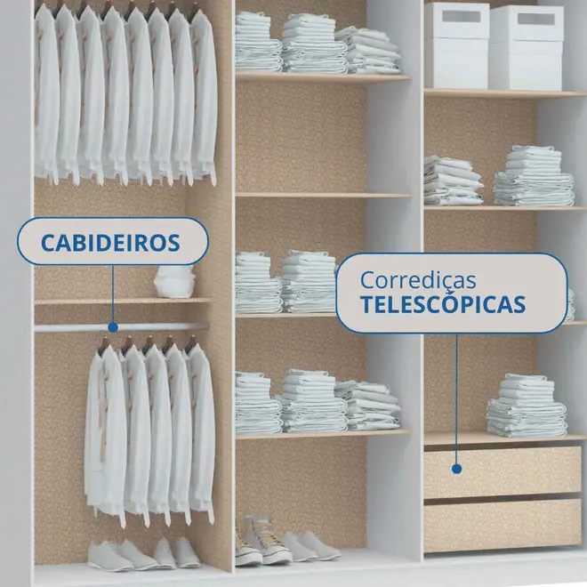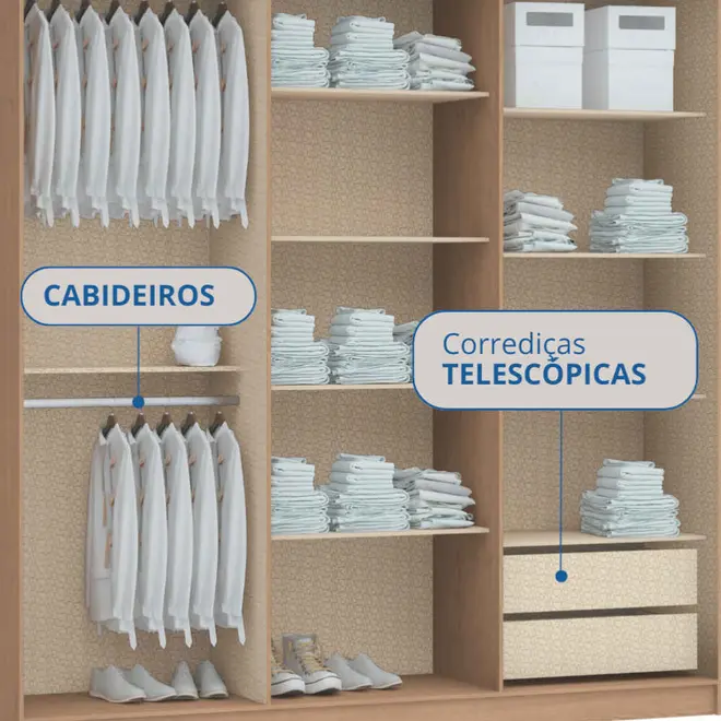 O destaque deste guarda-roupa está em seu amplo espaço interno, pensado para facilitar sua rotina e manter tudo sempre organizado. Ele conta com 2 gavetas espaçosas, ideais para guardar itens menores, além de prateleiras bem distribuídas que permitem acomodar roupas dobradas, calçados ou acessórios com facilidade. Os cabideiros estrategicamente posicionados completam o conjunto, garantindo que suas peças fiquem penduradas de forma prática e acessível.