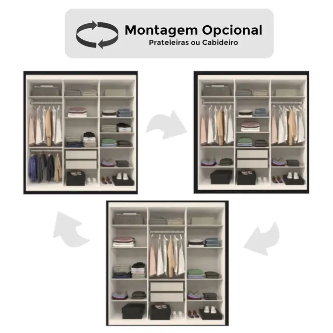 Uma das principais diferenças do Guarda-Roupa PH1804 é sua opção de montagem flex, permitindo ao usuário personalizar a organização interna do móvel de acordo com suas necessidades. Com essa flexibilidade, é possível escolher entre adicionar mais prateleiras para maximizar o espaço de armazenamento ou incluir um cabideiro extra para roupas penduradas.