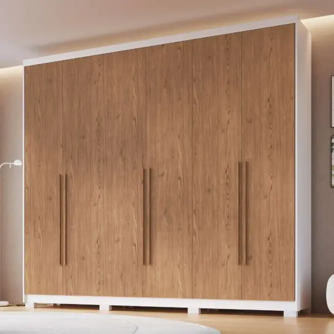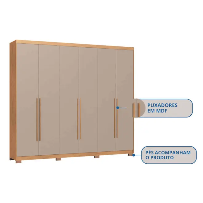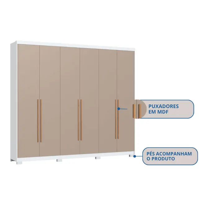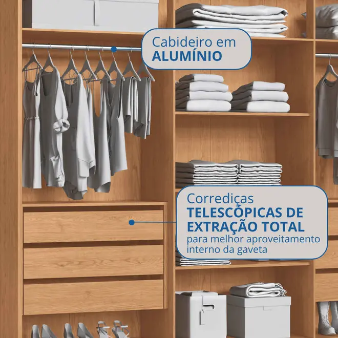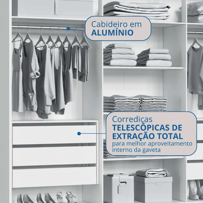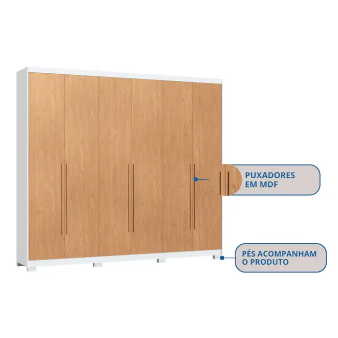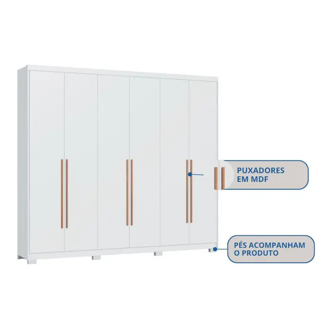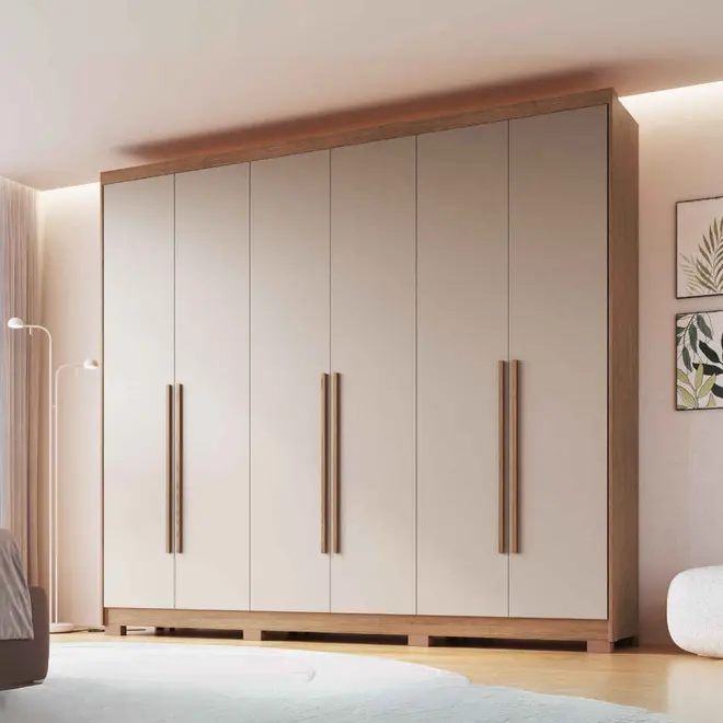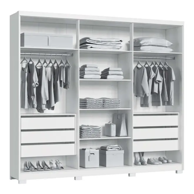 O seu amplo espaço interno é dividido em 6 portas, que facilitam o acesso ao interno do móvel de forma prática e organizada. O interior conta com 6 prateleiras bem distribuídas para acomodar roupas, calçados e objetos pessoais, além de 6 gavetas funcionais, ideais para armazenar peças menores ou mais delicadas. As dobradiças de 35mm com amortecedor proporcionam um fechamento suave e silencioso das portas, enquanto as corrediças telescópicas com extração total garantem que as gavetas deslizem com leveza e ofereçam acesso completo ao seu interior.
