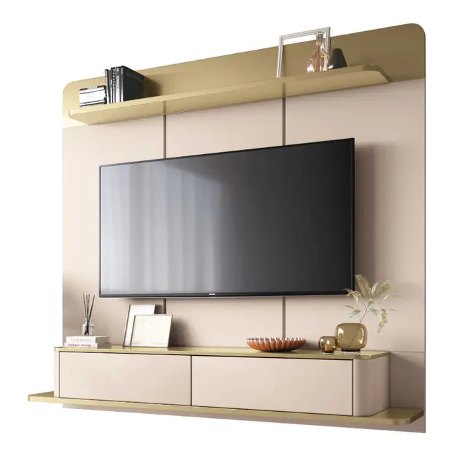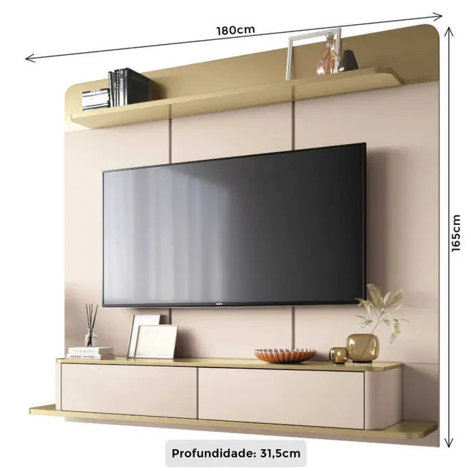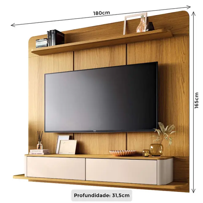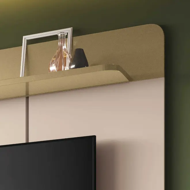 A prateleira superior oferece espaço extra para decoração ou aparelhos eletrônicos, reforçando a funcionalidade do móvel sem comprometer o design. Produzido com materiais de qualidade, em MDP e MDF, o painel assegura durabilidade, resistência e um belo acabamento.