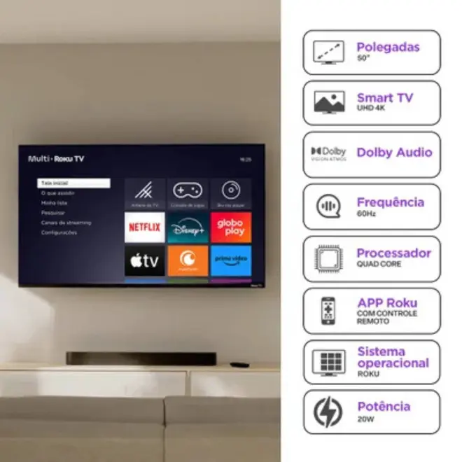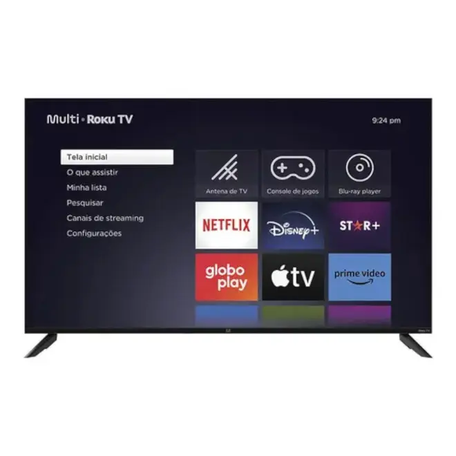 Pensando sempre no melhor para o consumidor essa Smart TV oferece uma experiência de entretenimento completa e integrada, permitindo que você aproveite seus conteúdos favoritos de diversas plataformas diretamente na tela da sua TV. Com o Roku TV, você tem acesso a uma vasta gama de serviços de streaming, incluindo Netflix, Disney+, Apple TV, MAX, Prime Video, Sky+, Pluto TV, Globoplay, Paramount+, Mubi e muitos outros, tudo disponível na loja de canais Roku. A interface intuitiva e de fácil navegação garante que você possa explorar suas opções de conteúdo de maneira descomplicada, sem perder tempo com configurações complexas.