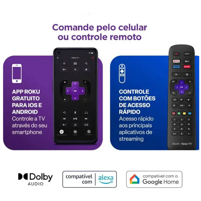 Além disso, a experiência de navegação se torna ainda mais prática e personalizada, com o controle remoto que possui botões dedicados para acesso rápido a serviços como Netflix, Apple TV, Prime Video e Globoplay, tornando o processo de encontrar e assistir aos seus programas preferidos ainda mais ágil. Para quem prefere maior comodidade, também é possível controlar a TV através do smartphone, utilizando o aplicativo Roku, com ele, você pode navegar pela interface da TV, ajustar o volume, mudar de canal ou até mesmo utilizar comandos de voz, tornando a experiência mais fluida e interativa.
