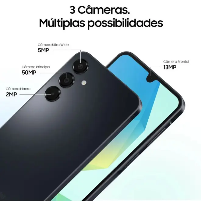 Se você é o tipo de pessoa que gosta de registrar todos os momentos do seu dia, viagens e passeios, o Smartphone Galaxy A16 é uma boa opção, com câmera traseira tripla de 50MP + 5MP + 2MP garante fotos nítidas de alta qualidade e para aquele selfie de qualidade para suas redes sociais você conta com a câmera frontal de 13MP.