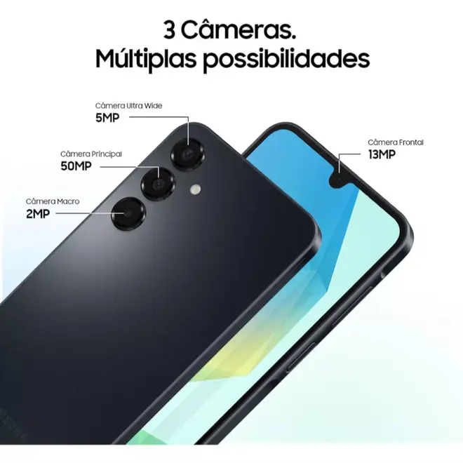 Equipado com uma câmera traseira tripla 50MP + 5MP + 2MP o Galaxy A16 proporciona fotos nítidas e de alta qualidade mesmo em ambientes com menos iluminação, e ainda conta com um zoom digital de até 10x. Além disso, com esse smartphone, você conta com uma câmera frontal de 13MP ideal para registrar selfie em qualquer lugar!