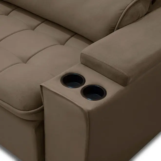 Ademais, ele possui revestimento em veludo, proporcionando maciez e suavidade ao toque, além de trazer modernidade ao mobiliário e ao ambiente. E claro, não podemos esquecer do grande diferencial dessa peça, ela possui um porta-copos feito em poliuretano, um plástico mais resistente a impactos, mas se preferir não utilizá-lo no momento, pode puxar o braço de volta!