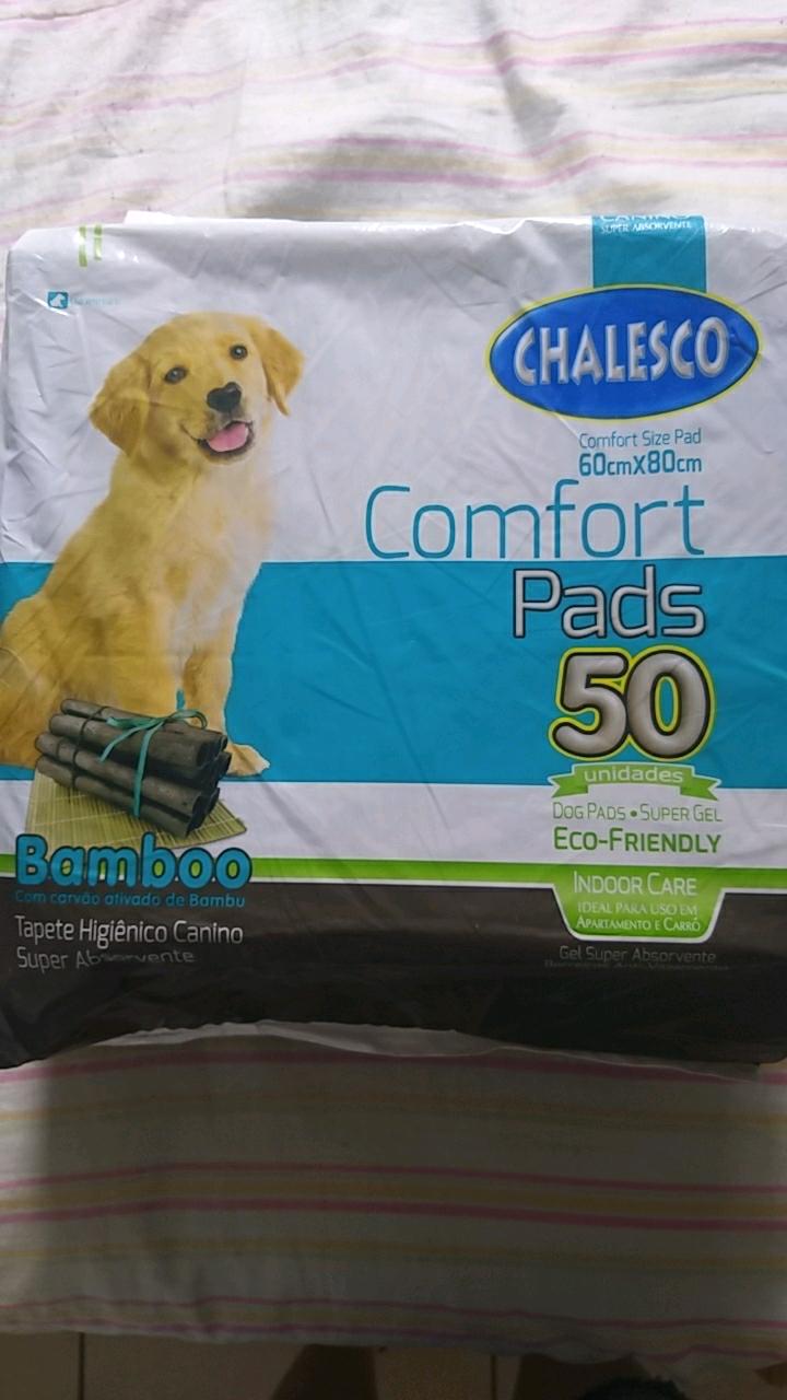 Tapete Higiênico Comfort Bamboo Cães Chalesco C/50 Unidades - Indicado para cães; - Super absorvente; - Barreiras anti-vazamento; - Com atrativo canino; - Com carvão ativado de bambu; - Tamanho 60cm x 80cm. O Tapete Higiênico Comfort Bamboo Cães Chalesco é ecológico e possui carvão ativado de Bambu para neutralizar o mau odor. É ultrafino com super absorção e contém sistema de abas contra vazamento, além do Gel Super Absorvente. - Super Absorventes; - Com atrativo canino; - Ecologicamente correto; - Feito com carvão ativado; - Ideal para pequenos espaços ou apartamentos. - Acompanha adesivo para fixação; Modo de usar Observe onde seu cãozinho costuma fazer as necessidades e coloque o tapete próximo, caso não queira que ele continue naquele espaço troque o lugar se necessário, e lembre-se que a troca de lugar pode levar um tempo para que seu cão se acostume. O tapete higiênico é uma forma de atrair o cão como uma espécie de treinamento, onde saberá o local correto para realizar suas necessidades Medidas aproximadas Tamanho: 60cm x 80cm