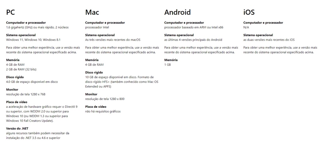 iOS: o Office para IOS (inclusive Outlook para iOS) é compatível com as duas versões mais recentes do iOS e iPadOS. Quando uma nova versão do iOS ou iPadOS é lançada, o requisito do sistema operacional do Office se torna as duas versões mais recentes: a nova versão do iOS ou iPadOS e a anterior)
