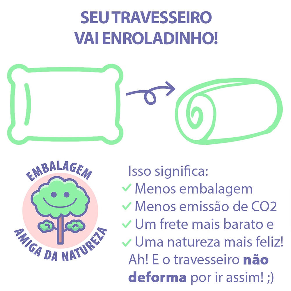 Pensando na sustentabilidade, enviamos seu travesseiro compactado e enrolado. Isso reduz o uso de embalagens, economiza espaço no transporte e diminui a emissão de CO₂, tornando a entrega mais sustentável e acessível para você.