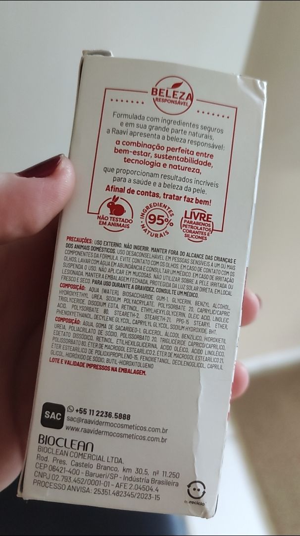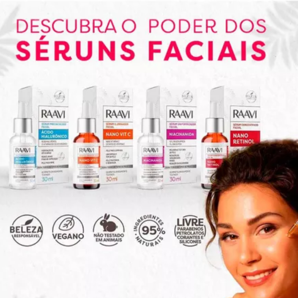 Raavi sérum concentrado facialNano retinolRedução de rugas acentuadasMelhora na elasticidade e firmeza da pele-Para todos o tipo de pele-Vegano-Dermatologicamente testadoO retinol é um ativo derivado da vitamina A, amplamente utilizado nos cuidados da pele.Reconhecido como uma das mais eficazes vitaminas com potencial antirrugas.O uso regular o sérum contribui para uma melhora significativa na elasticidade da pele, resultado em uma pele mais firme e saudável.O sérum age profundamente na pele, auxiliando na redução de rugas acentuadas, melhorando a firmeza e a elasticidade da pele.Sua formula aquosa é de textura leve e rápida absorção.A tecnologia inovadora de encapsulação do retinol garante uma formula mais segura, com alta eficácia nos resultados e máxima tolerância na pele.Modo de uso:-Aplique á noite, sobre a pele limpa e seca, aplique uma camada homogênea, sobre o rosto, massageando com movimentos circulares e ascendentes.-Pela manhã lavar o rosto com sabonete e utilizar o protetor solar.Durante as primeiras semanas de uso, aplique em dias alternado e evite usar produtos com alta concentração de ativos antes do sérum.
