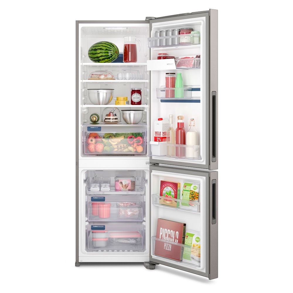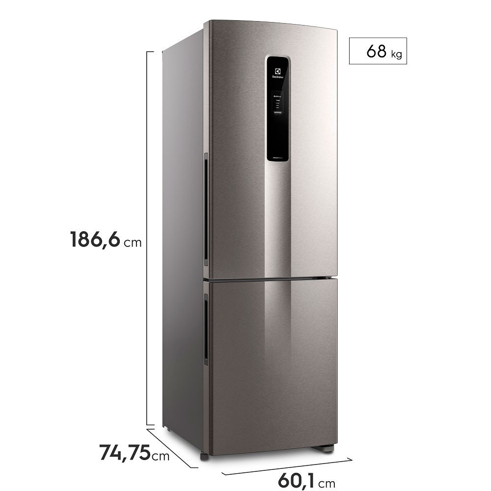 A Geladeira Electrolux Inverse Efficient 400 Litros cor Inox Look (DB44S) possui tecnologia AutoSense, que utiliza Inteligência Artificial para controlar a temperatura automaticamente, prolongando a vida dos alimentos por até 30 mais tempo. Trata-se de uma tecnologia exclusiva Electrolux, que reconhece as suas rotinas, identificando os momentos de maior uso e de abertura de portas, ficando automaticamente mais fria. Ou reconhece os momentos de menor uso (durante a noite ou férias, por exemplo) e estabiliza a temperatura, além de reduzir possíveis ruídos. Além disso, a Gaveta HortiFruti preserva frutas e verduras por mais tempo. E para ter gelo fácil sempre, possui o Ice Max. Um compartimento com abertura exclusiva que permite a reposição da água sem respingar e sem misturar odores com o restante do freezer (vendido separadamente). A geladeira oferece também um interior amplo e versátil, graças ao FastAdapt, que permite 20 configurações internas para armazenar alimentos de diferentes tamanhos. Características: Refrigerador Marca: Electrolux Modelo: DB44S Número de Portas: 02 Sistema: Frost Free Cor da Porta: Inox Look Acabamento Lateral: Cinza Acabamento Frontal: Inox Look Acabamento da Porta: Inox Look Cor do Gabinete: Cinza Pés Niveladores: Sim Frequência: 60Hz Controle de Temperatura: Automático/Manual Consumo de Energia: 48.4 kW/h Sistema de Refrigeração: Compressor Painel Digital: Sim Capacidade Total do Refrigerador: 400 Litros Capacidade Liquida do Refrigerador: 275 Litros Capacidade Total Bruta: 429 Litros Capacidade Bruta Refrigerador: 284 Litros Capacidade total do Freezer: 125 Litros Classificação Energética: A++ Material dos Puxadores: Plástico Função Turbo: Sim Prateleiras Removíveis: Sim Quantidade de Prateleiras: Refrigerador: 3 prateleiras/1 gaveta Porta Refrigerador: 4 prateleiras Porta Freezer: 2 prateleiras Freezer: 2 gavetas Puxadores Embutidos Prateleiras na Porta: Sim Prateleiras de Vidro Temperado: Sim Material das Prateleiras Gabinete: vidro / Porta: plástico transparente Cesta porta Ovos: Sim Separador de Garrafas: Sim Degelo Automático: Sim Alarme de Porta Aberta: Sim Compartimento Congelamento Rápido: Sim Temperatura do congelador: -18 graus C Prateleira Reversível: Sim Prateleiras Retráteis: Sim Porta Latas (prateleira de latas): Sim Iluminação Interna Refrigerador: Sim Porta Laticínios (prateleira de laticínios): Sim Tecnologia Inverter: Não Iluminação Interna Freezer: Não Máquina de Gelo Automática: Não Compartimento Extra Frio: Não Recipiente para Guardar Gelo: Não Alarme de Temperatura: Não Gavetas Externas: Não Porta Reversível: Não Desodorizador: Não Agua na Porta: Não Gelo na Porta: Não Home Bar: Não Selo Procel: Não Conteúdo da Embalagem: 01 Refrigerador DB44S Inverse Efficient 400 Litros Electrolux Dimensões Altura: 186,5 cm Largura: 60,1 cm Profundidade: 74,75 cm Peso: 68 Kg Garantia do Fornecedor: 12 meses