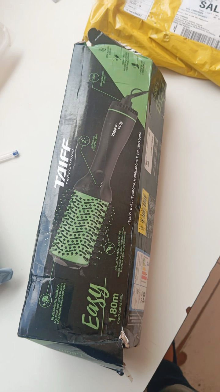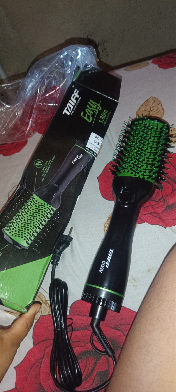 Escova Secadora Taiff Easy Oval 1200W, Preta/Verde 220V FICAR AINDA MAIS LINDA, THÁ EASY! Quem busca praticidade para o dia a dia e para a beleza agora pode contar com a sua mais nova aliada: a escova secadora Easy, que possibilita cabelos impecáveis sem sair de casa. Com potência de 1200W, é indicada para secar todos os tipos de cabelos e ainda vem em verde. Ela possui um revestimento térmico e o tamanho ideal, que permite alisar e modelar rapidamente. Em formato oval e com cerdas de Nylon de dupla altura, a escova garante melhor tração ao cabelo, proporcionando fios com muito mais brilho. Ela ainda conta com 2 temperaturas e ar frio, que garantem resultados incríveis e duradouros, possui cabo giratório de 1,80m e é compacta e leve. Com essa escova ficou muito Easy ter o cabelo que quiser! FORMATO OVAL Seca, modela e volumiza. Ideal para todos os tipos de cabelo. REVESTIMENTO METÁLICO Acelera o proecesso e garante modelagens mais duradouras. CERDAS DE NYLON DUPLA ALTURA Melhor tração ao cabelo, proporcionando fios polidos com muito mais brilho ESPECIFICAÇÕES TÉCNICAS Cor: Preta e Verde Potência Máxima: 1.200 W Nível Temperatura: 3 Garantia do Fabricante: 6 Meses Cabo Giratório: Sim Comprimento do Cabo: 1,80 MT Jato de Ar Frio: Sim Termostato: Sim Motor: DC-18V ITENS INCLUSOS Escova Secadora: 1 ALIMENTAÇÃO Voltagem: 220V Consumo: 1,2 KHZ DIMENSÕES Dimensões do produto com embalagem (comp x larg x alt): 430 x 110 x 60 mm Dimensões do produto sem embalagem (comp x larg x alt): 370 x 50 x 50 mm Peso do produto com embalagem: 0,560 Kg Peso do produto sem embalagem: 0,469 Kg