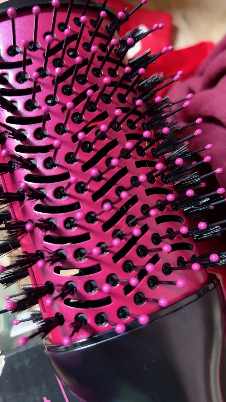 Ela seca, alisa, modela e dá volume. Suas cerdas laterais de dupla altura tracionam os fios, resultando em um efeito de brilho e polimento.