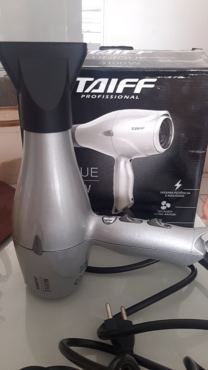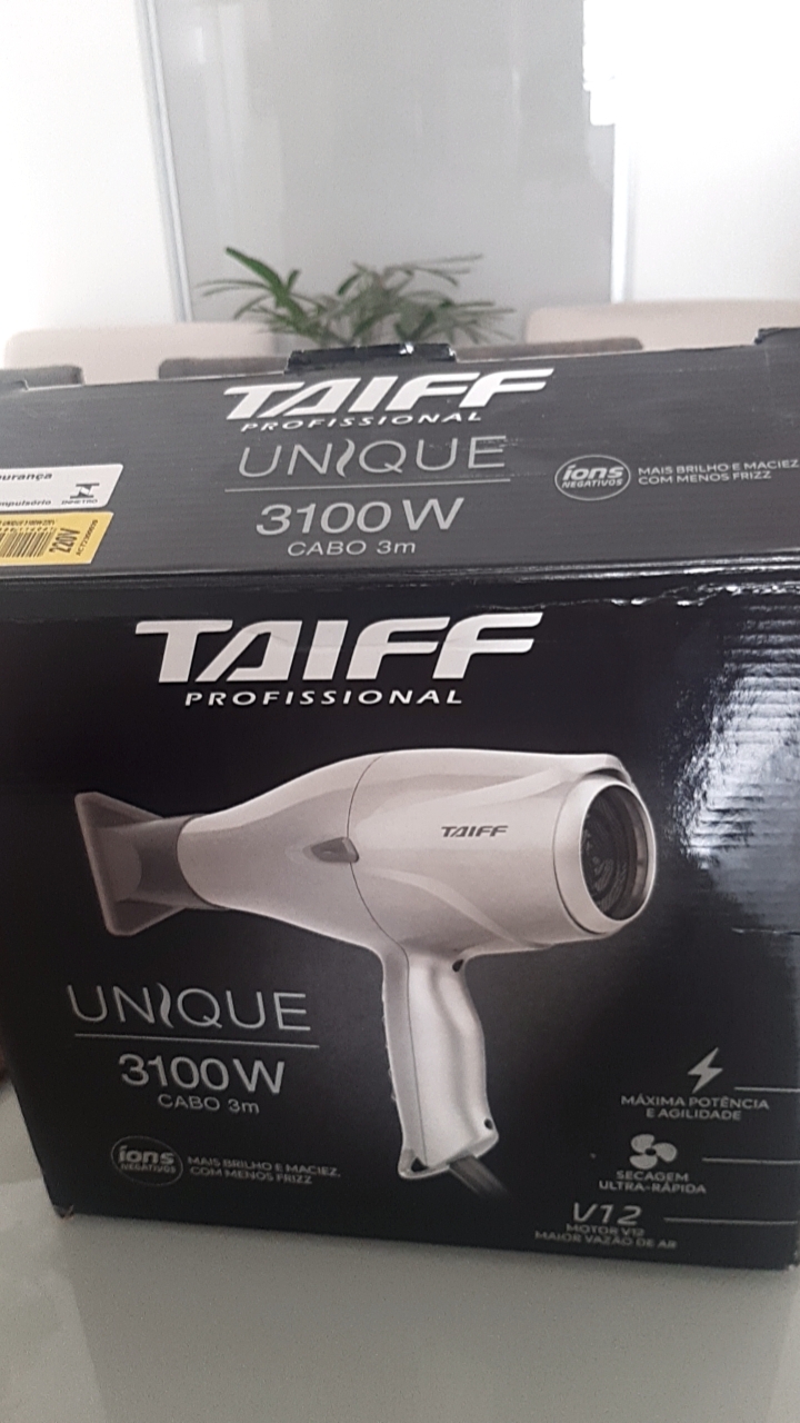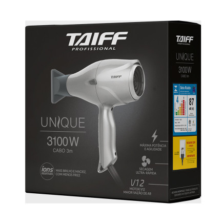 SECADOR DE CABELO TAIFF UNIQUE 3100W 3M+CABO -220V A MAIOR POTÊNCIA DO MERCADO O Unique 3100 atingiu o ápice da potência em um secador. Com 3100W, ele veio para redefinir os limites e foi desenvolvido para profissionais exigentes que buscam máximo desempenho e velocidade, principalmente para processos químicos. O motor profissional que proporciona alta vazão de ar garante um resultado rápido, eficaz e impecável com praticidade. Íons negativos selam as cutículas dos fios, deixando-os mais macios, sedosos e sem frizz e o botão de jato de ar frio ajuda a fixar a modelagem, além de dar brilho imediato aos cabelos. Possui tampa traseira removível magnética, facilitando a limpeza para garantir maior durabilidade e qualidade ao secador. E o cabo de 3 metros de comprimento permite ao profissional maior mobilidade para os mais variados tratamentos e penteados. CARACTERÍSTICAS -Potência de 3100W -Íons negativos: neutralizam a eletricidade estática dos fios e fecham as cutículas, proporcionando fios disciplinados com muito mais brilho, maciez e sem frizz -Botão de jato de ar frio: melhor fixação do penteado e muito mais brilho -Disponível em 220V -Tampa traseira removível: facilita a limpeza e a manutenção do produto -1 bico direcionador de ar -Cabo de 3 metros de comprimento: dá mais liberdade para o profissional que precisa de espaço para se locomover em seu salão -Prazo de garantia: 6 meses. DIMENSÕES -Produto: comp x alt x larg: 217,2 x 227,9 X 92,5 mm -Embalagem: comp x larg x alt: 256 x 101 x 251 mm