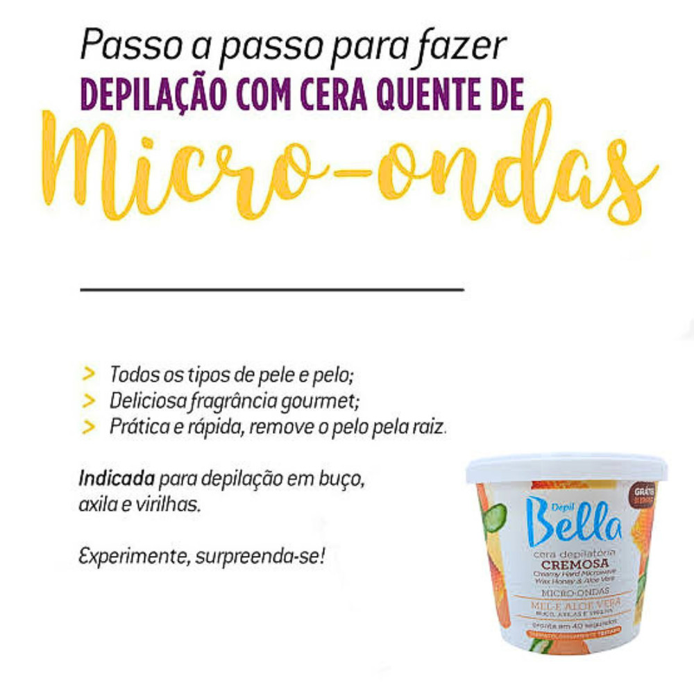 A Cera De Micro Ondas Mel E Aloe Vera Depil Bella é indicada para todos os tipos de pele e pelo. Alternativa rápida e eficaz para depilação do corpo e rosto, fica pronta por aquecimento de micro-ondas em apenas 40 segundos. Embalagem 100% segura - aquecimento por micro-ondas, banho-maria ou aquecedores elétricos (termoceras). Indicado para buço, axílas e virilha*. Dermatologicamente testado. Não testado em animais.