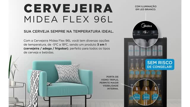 Sua cerveja sempre na temperatura ideal, sem risco de congelar! Com a Cervejeira Midea 96L você tem diversas opções de temperatura, de -5 a 18ºC, sendo um produto 3 m 1 (adega / frigobar / cervejeira), perfeito para todos os tipos de cerveja e bebidas. Com a iluminação em led branco e porta de vidro triplo você consegue sempre conferir o estoque. Características Gerais - Produto 3 em 1: Cervejeira, frigobar ou adega devido ao controle térmico de -5°C a 18ºC. - Sistema de Refrigeração Frost Free. Não precisa se preocupar, o degelo é automático. - Muito mais silenciosa: (comparada aos modelos BCA81/BCA82) - Porta de Vidro Triplo: Cervejas no ponto certo. - Memória Inteligente: Volta à temperatura na falta de energia - Display digital: Para escolher a temperatura ideal para sua cerveja. - Baixo Nível de Ruído: Sem incômodos no seu dia a dia - Puxador Ergonômico: Mais praticidade para pegar a sua cerveja. - Iluminação Interna Especial: Valoriza ainda mais a sua coleção. Especificações Técnicas Quantidade de portas: 1 Quantidade de prateleiras: 3 Frost Free: Sim Capacidade total (litros): 96 Temperatura: 5° C (negativo) a 18° C (positivo) Potência total (W): 90W Tensão/Voltagem - 110V - 220V Conteúdo da embalagem 1- Cervejeira Midea Flex BCA10P Preta ? 96 Litros Dicas de Utilização Armazenagem: 105 latinhas 350ml 62 latões 473ml 27 garrafas long neck + 12 latinhas 350ml 58 garrafas long neck 355ml 83 latinhas 350ml comprida 30 garrafas 600ml 5 barris 5 litros Entrega do Produto - Não nos responsabilizamos pelo transporte por escadas/elevadores, guincho ou içamento deste produto. - Não nos responsabilizamos pela instalação/montagem Dimensões Altura: 84,50 cm Largura: 48,00 cm Profundidade: 47,50 cm Garantia 12 meses + 10 anos de garantia APENAS no compressor