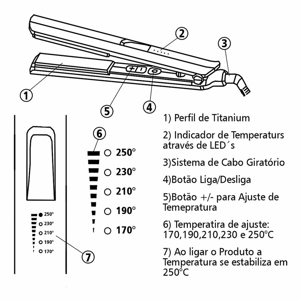 Você já passou horas lutando contra o frizz e a falta de brilho nos seus cabelos durante o alisamento? Se sim, você sabe o quão frustrante pode ser obter resultados abaixo do esperado, mesmo com tanto esforço. Principalmente em processos Quimicos sabemos que é dificil encontrar uma chapinha adequada para isso Pensando nisso apresentamos a Chapinha Titanium Progress da Taiff, a solução definitiva para todos os seus problemas de alisamento! Equipada com tecnologia avançada de sensor eletrônico e sistema duplo de segurança, esta chapinha garante que a temperatura permaneça estável, evitando oscilações e superaquecimento. Diga adeus ao frizz e às pontas ressecadas, e dê as boas-vindas a cabelos mais lisos, brilhantes e macios! Transforme sua rotina de beleza e alcance resultados profissionais no conforto da sua casa, ou no seu estabelecimento. Benefícios do Produto: -Alisamento perfeito da raiz às pontas. -Mais brilho e maciez, com menos frizz, graças aos íons negativos. -Aquecimento ultra rápido com tecnologia MCH. -Cinco temperaturas ajustáveis, ideais para todos os tipos de cabelo e procedimentos. Especificações Técnicas do Produto: -Temperatura ajustável de 170 a 250°C: 170°C: Indicada para Cabelos Finos e Sensiveis; 190°C: Versátil, para alisar Todos os Tipos de Cabelos; 210°C: Ideal para atingir o Liso Perfeito; 230°C: Recomendada para Processos Quimicos, alisamentos e outros; 250°C: Recomendada para Processos Quimicos, alisamentos em Cabelos Grossos e Resistentes. -Cabo giratório de 3 metros para maior comodidade. -Bordas estreitas e perfil largo para alisamento rápido e próximo da raiz. -Bivolt automático para uso em qualquer lugar do mundo. Além disso à um garantia de 6 meses contra defeitos de fabricação, proporcionando segurança e confiança para sua compra. Conteúdo: -1 Chapinha Titanium Progress -1 Manual de intruções Aproveite esta oportunidade para conquistar cabelos incríveis todos os dias! Não deixe essa oferta passar. Adquira já sua Chapinha Titanium Progress da Taiff e transforme sua rotina de beleza! Agradecemos a sua visita e estamos ansiosos para fazer parte da sua jornada de cuidados com os cabelos.
