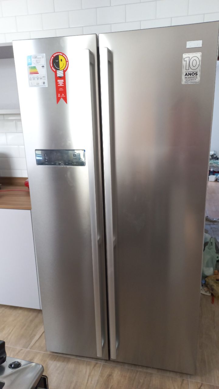 O novo refrigerador side by side Midea vai te surpreender! Ele conta com freezer de alta capacidade de 184L, com 2 gavetas, 3 prateleiras na porta e 3 prateleiras internas. Super economico, possui gaveta dupla de frutas e legumes que permite melhor organização dos alimentos, painel touch que facilita o manuseio, prateleiras de vidro para maior estabilidade para latas e garrafas e ice twister, gelo fácil em apenas um toque. Características - Maxi Freezer: com capacidade de 184L, com 2 gavetas, 3 prateleiras na porta e 3 prateleiras internas. Sua comida organizada do jeito que você quiser. - Frost free: sem preocupação com o degelo. É automático! - Painel Touch: facilita o manuseio do refrigerador, tendo acesso a todas as funções do produto externamente. - Função Turbo tanto no Freezer como no Refrigerador - Super econômico - Modo Férias - Trava de segurança para crianças - Iluminação em LED tanto para o Freezer como para o Refrigerador - Ice twister: gelo fácil em apenas um toque - Prateleiras de vidro: maior estabilidade para latas e garrafas. - Gaveta horti-fruti Especificações Técnicas Código Fornecedor: MD-RS587FGA041 / MD-RS587FGA042 Fabricante: Midea Eficiência energética: Selo Procel A Capacidade: 528L Capacidade Freezer: 184L Capacidade Refrigerador: 344L Painel: Touch Funções: Turbo Freezer, Turbo Refrigerador, Trubo Freezer e Turbo Refrigerador e Férias Cor interna: Branco Cor externa: Inox (Pintado de Inox) Material interno: PSAI Material externo: Aço galvanizado Número de portas: 2 Gavetas Refrigerador: 2 Gavetas Freezer: 2 Prateleiras Refrigerador: 4 Prateleiras Freezer: 3 Gaveta para Frutas e Legumes: Sim Gaveta para Carnes: Sim Trava de segurança: Sim Função Férias: Sim Bandeja de ovos: Sim Ice Twist: Sim Dispenser: Não Potência de degelo: 240W Voltagem -100v -220v Tipo de degelo: Automático Agente expansor: Ciclopentano Gás Refrigerante: R600a Consumo aproximado de energia: 55 kWh/mês/50,2 kWh/mês Capacidade do Congelador: 10kg/24h Máxima Retenção sem Energia: 7h Frequência: 60 Hz Tipo de Tomada: 10A Itens inclusos na embalagem: 1 Refrigerador 1 manual Dimensões e Pesos Altura: 176,5 cm Largura: 89,5 cm Largura (Abertura máxima das portas): 157 cm Profundidade: 76,5 cm Profundidade com a porta aberta: 111,5 cm Peso liquido: 90kg Produto Embalado Altura: 185,5 cm Largura: 96,3 cm Profundidade: 77,8 cm Peso Bruto: 100kg Garantia de 12 meses e 10 anos de garantia no compressor