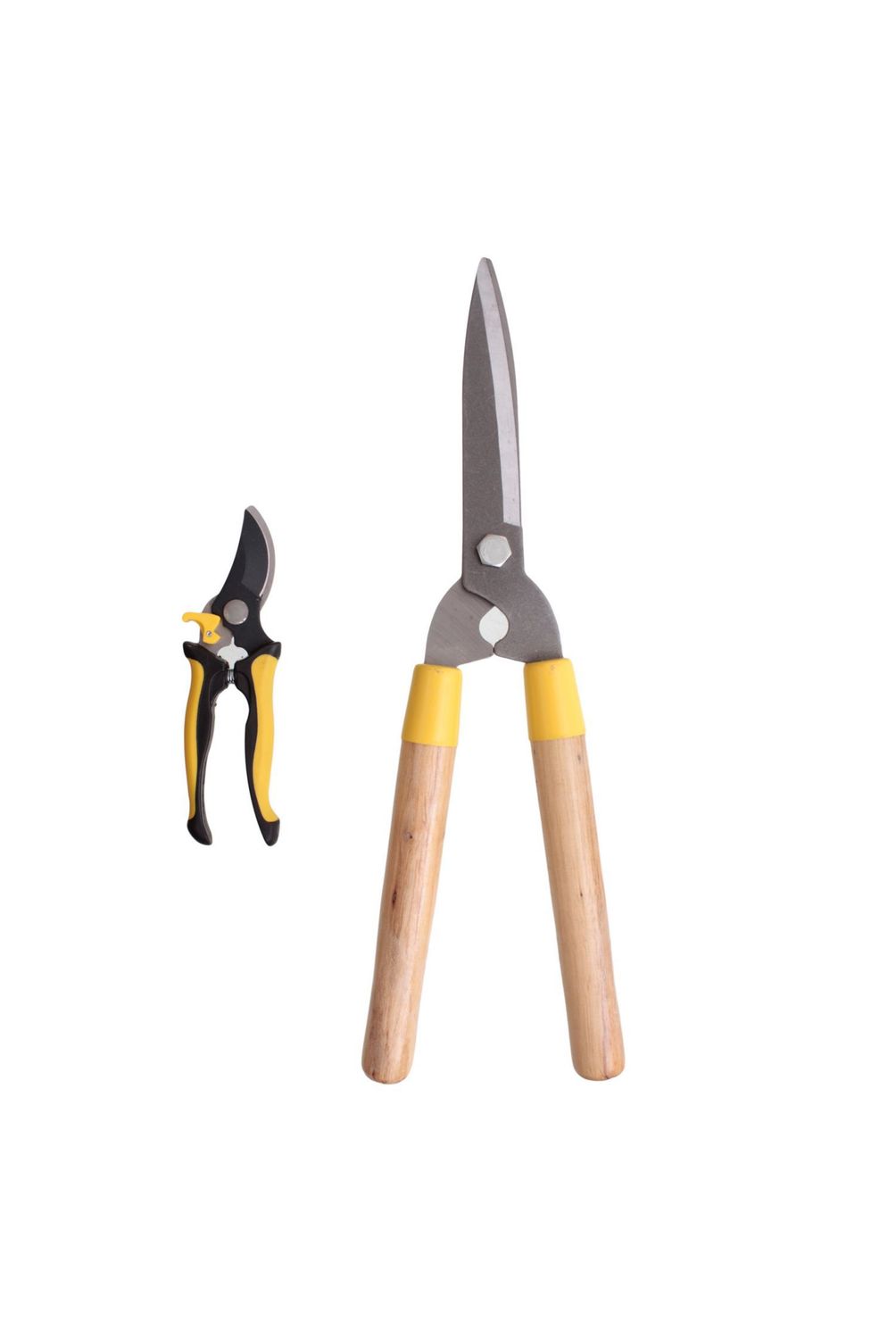 | Características | Tijera para cortar pasto: hoja de acero semiduro, mango de madera,tijera de poda bypass: cuerpo de acero, mango de plástico, hoja con antiadherente, seguro de cierre y diámetro de corte 3/4 " |