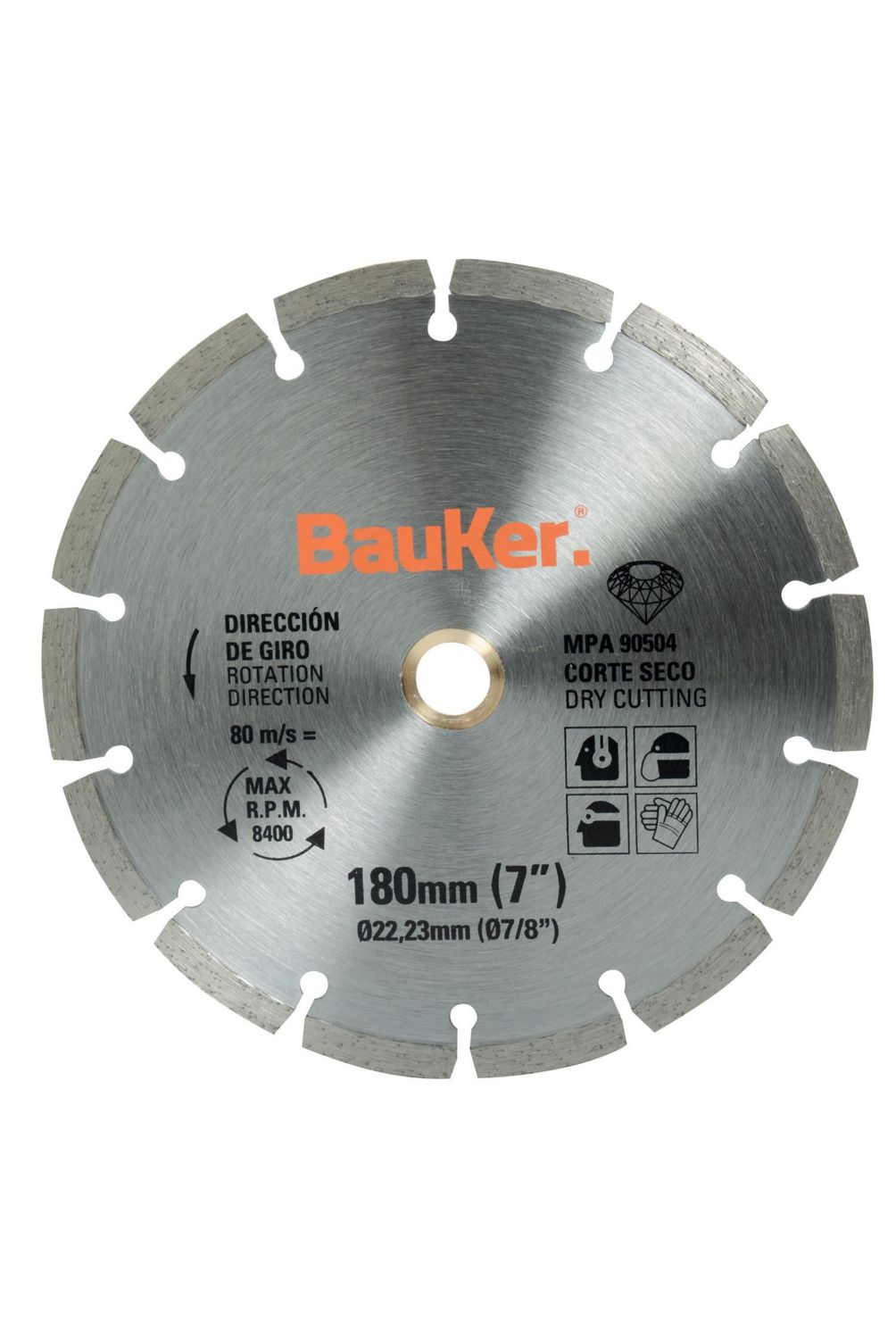 | Características | Diamantado, segmentado, se puede usar en esmeriles angulares, pulidoras, amoladoras con ejes de 16 mm, 22 mm y 23 mm, 8,400 RPM Max, para corte seco |