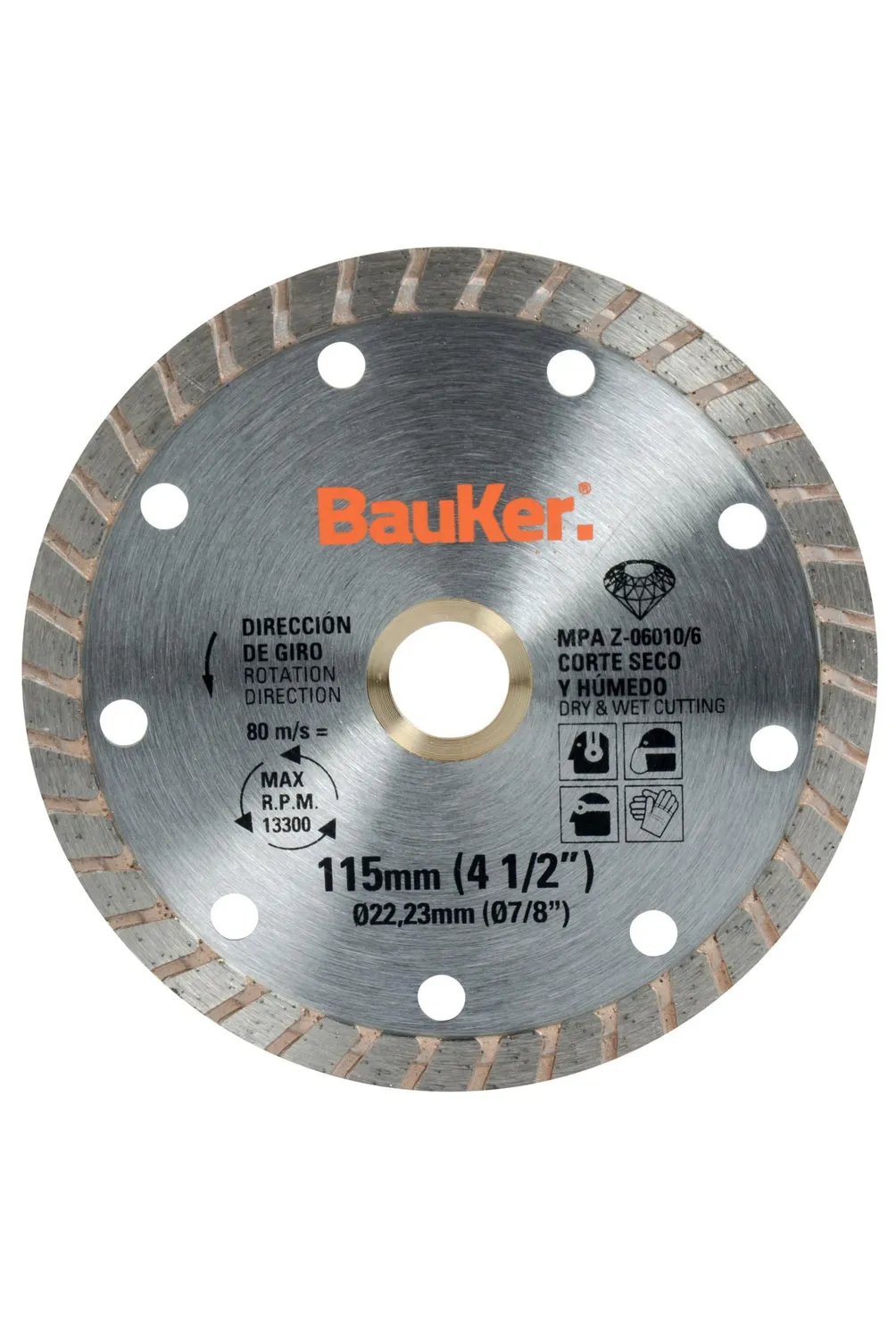 | Características | Diamantado, segmentado, se puede usar en esmeriles angulares, pulidoras, amoladoras con ejes de 16 mm, 22 mm y 23 mm, 13,300 RPM Max, para corte seco |