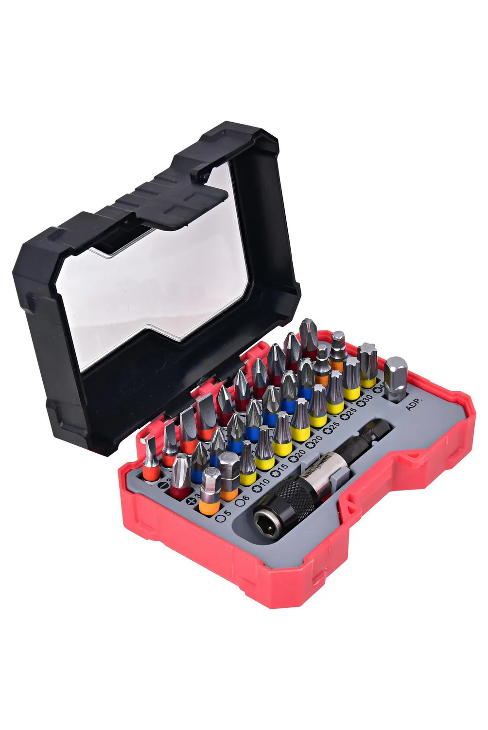 | Características | 30pc 1" S2 color bit: : SLOT 3, 4, 5.5, 6.5mm,PH #0 #1x2 #2x2 #3x2,PZ #0 #1x2 #2x2 #3x2,HEX 3, 4, 5, 6mm,TORX 10, 15, 20, 20, 25, 25, 30, 40 1pc bit adapter 1pc stainless steel quick change chuck |
