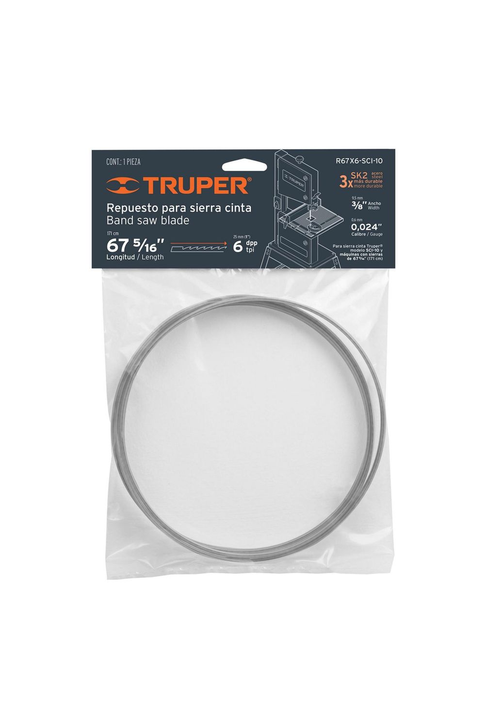 | Características | Fabricada de acero SK2, 3x más durable,Para sierra cinta modelo SCI-10 marca Truper® y máquinas con sierras de 67 5/16" (171 cm). |