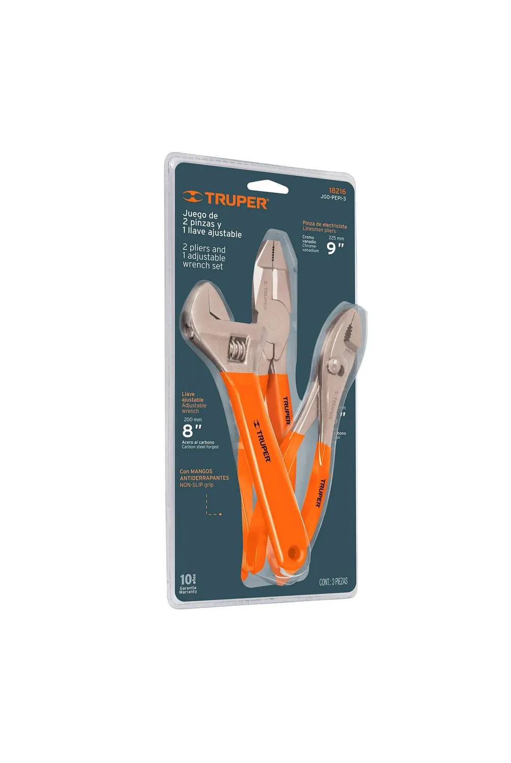 | Características | Acabado pulido para fácil limpieza, Llave ajustable y pinza de chofer fabricadas en acero al carbono, Mangos de PVC., Pinza de electricista fabricada en acero al cromo vanadio 2x más resistente al desgaste que las de acero al carbono |