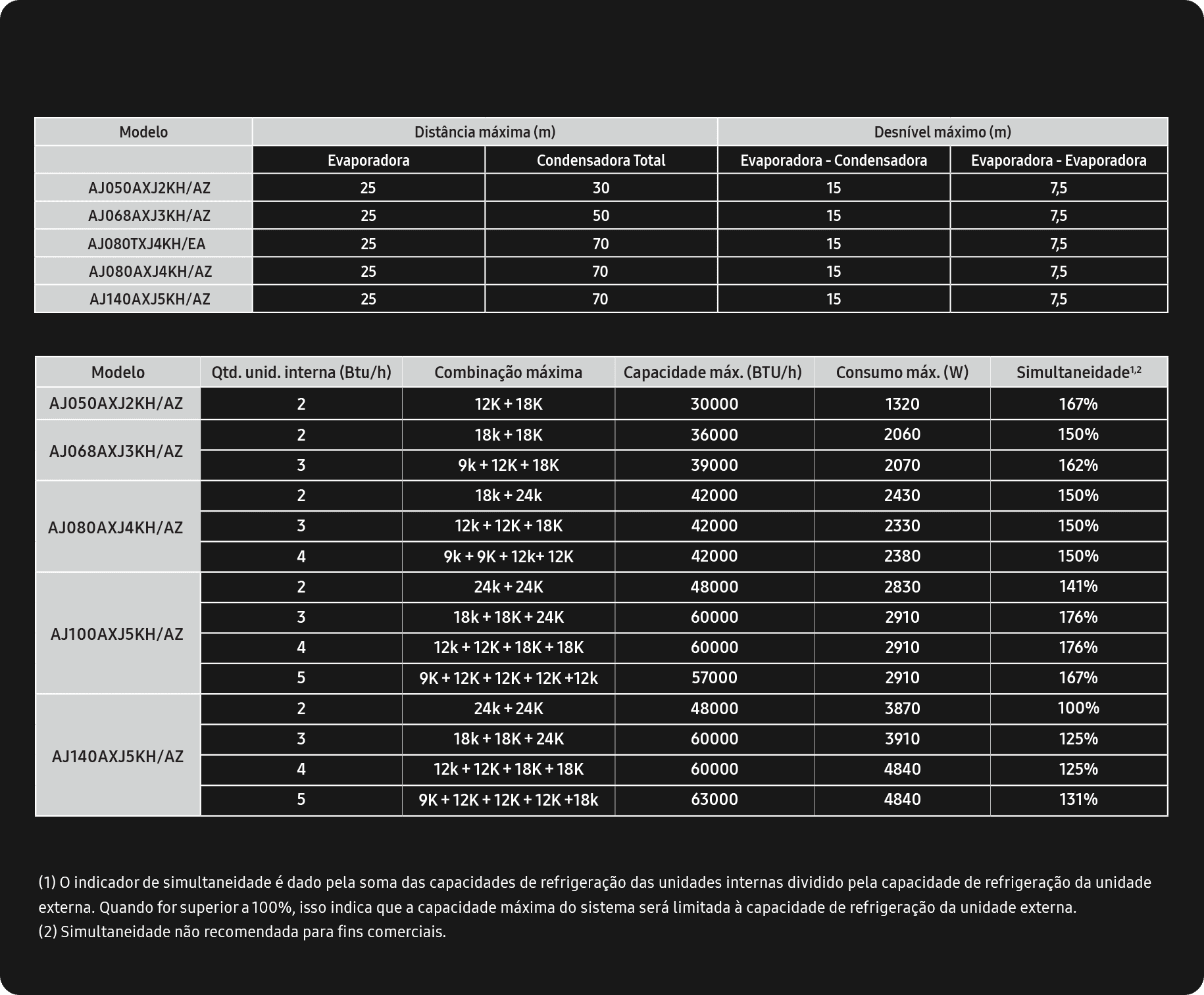 capacidade máxima total das unidades internas, quando ligadas simultaneamente, será até a capacidade máxima da unidade condensadora externa. Quando a soma das capacidades individuais de cada unidade interna for maior que a da unidade externa (taxa de simultaneidade maior que 100%), o sistema poderá não refrigerar plenamente todos os ambientes de forma simultânea. Dessa forma, as unidades internas não atingirão suas capacidades máximas individuais quando ligadas simultaneamente. Esta combinação é indicada somente para locais onde pelo menos uma unidade interna esteja desligada, ou com necessidade de refrigeração muito baixa. Consulte um especialista em carga térmica para mais informações ou nos contate na Central de Atendimento: 0800 555 0000