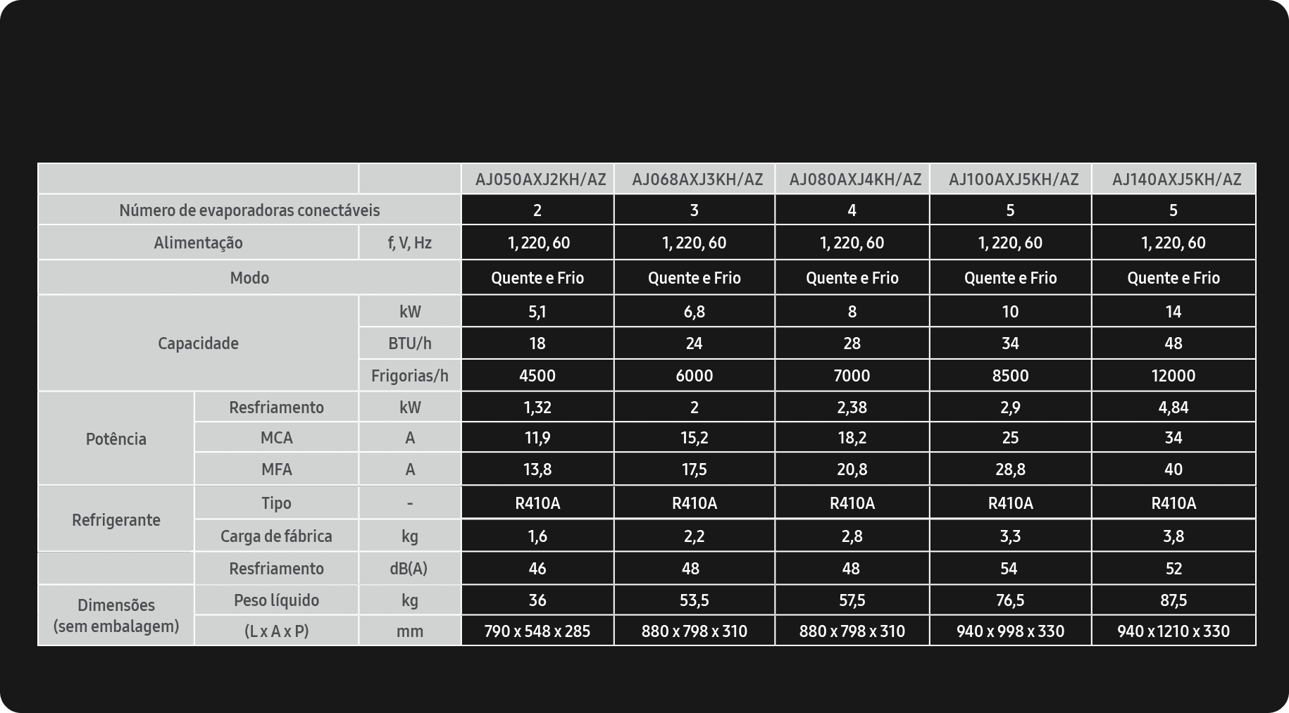 | Dimensões Condensadora (LxAxP)mm | 880 x 798 x 310 |