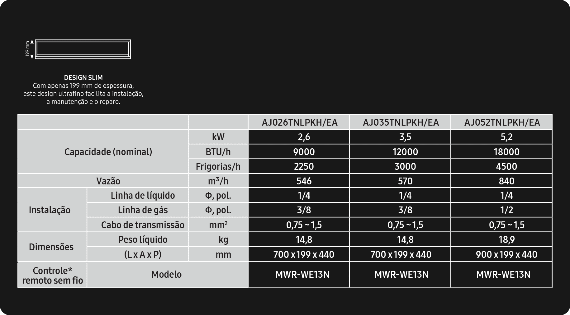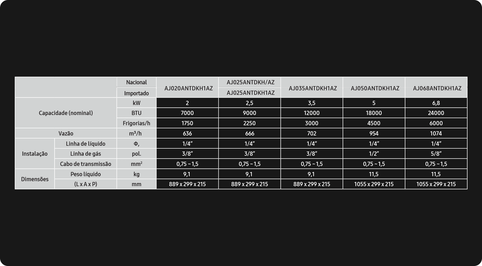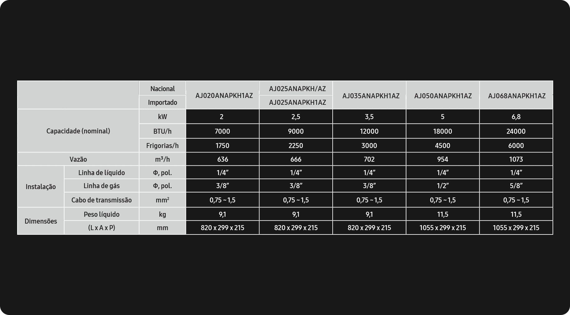 | Dimensões Evaporadora 2 (LxAxP)mm | 820 x 299 x 215 |