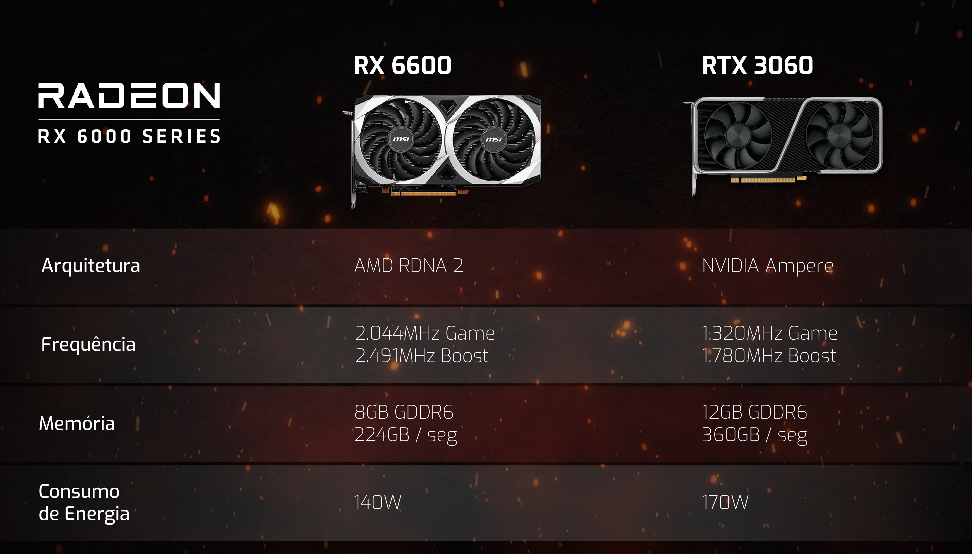 As placas de vídeo AMD Radeon ™ RX 6600 oferecem taxas de quadros ultra-altas e jogabilidade em 1080p. Obtenha a melhor experiência em jogos com novas unidades de computação poderosas, o inovador AMD Infinity Cache e até 8GB de memória GDDR6 dedicada. E, quando combinada com um processador de desktop AMD Ryzen ™ série 5000, a tecnologia AMD Smart Access Memory oferece novos níveis de desempenho em jogos.
