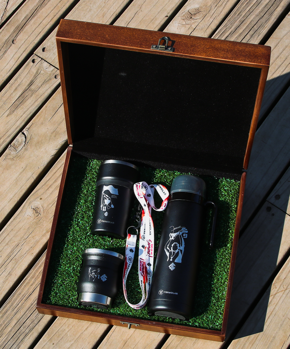 Este kit de edição limitada é composto por uma caixa de madeira com produtos Termolar: R-Evolution Preto Hub 1L com Rolha Clickmate Preta, Cuia Tupi 250mL Preta, Copo Pub 500mL Preto e um tirante exclusivo.