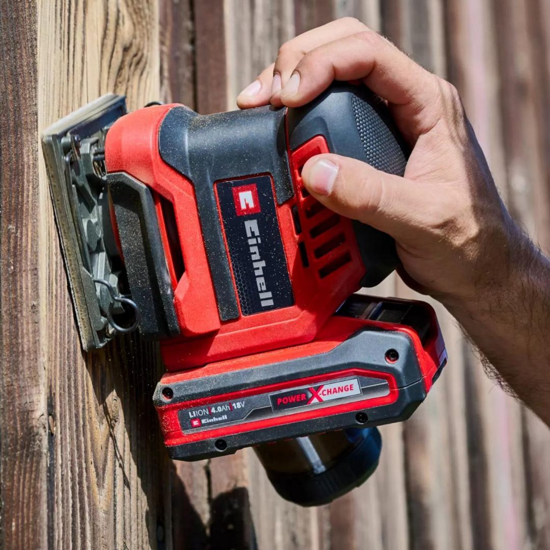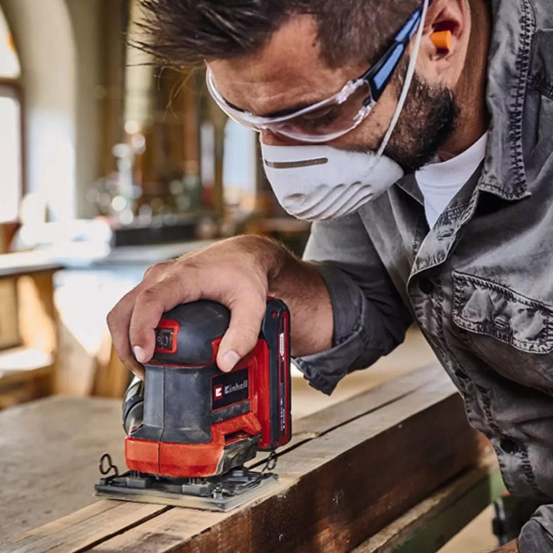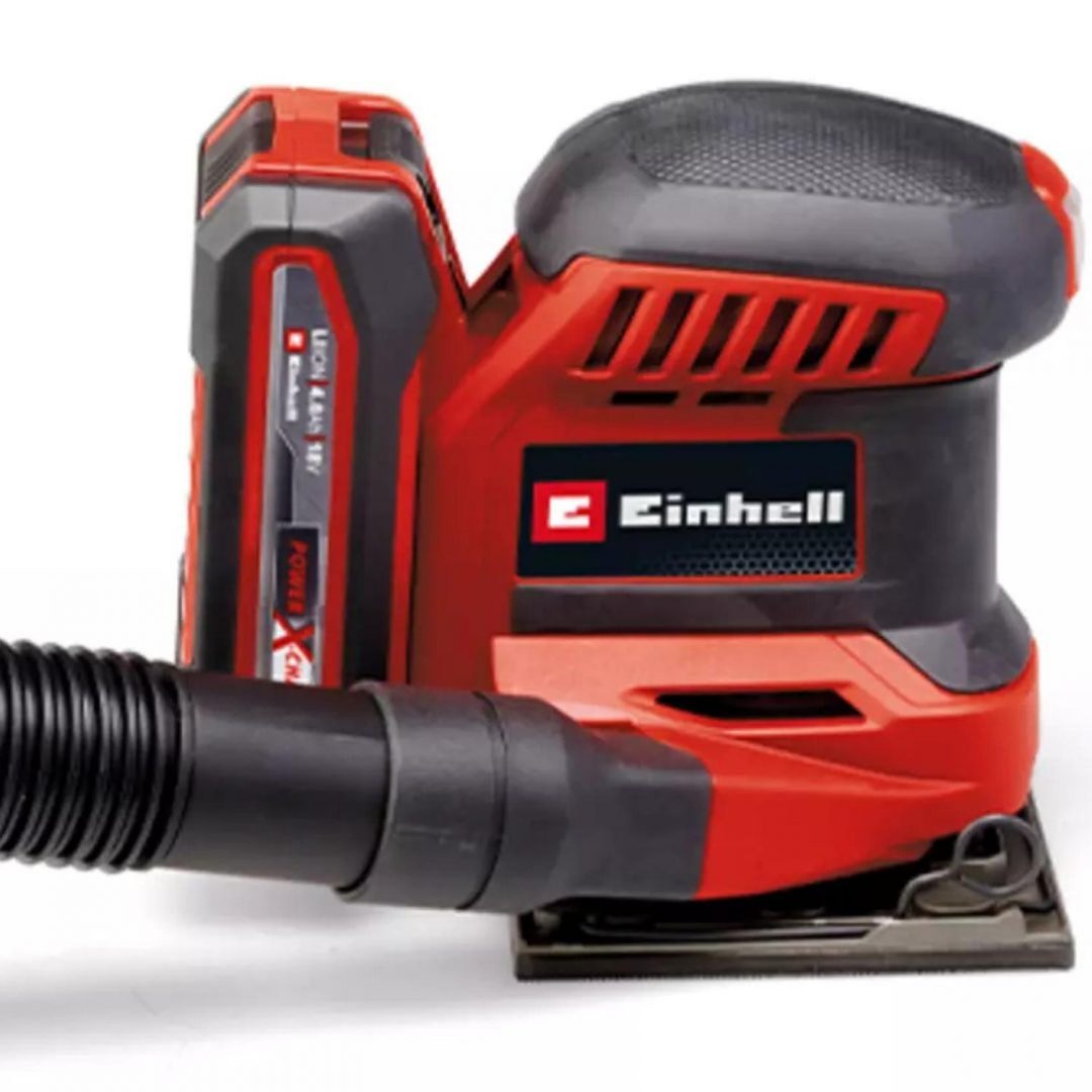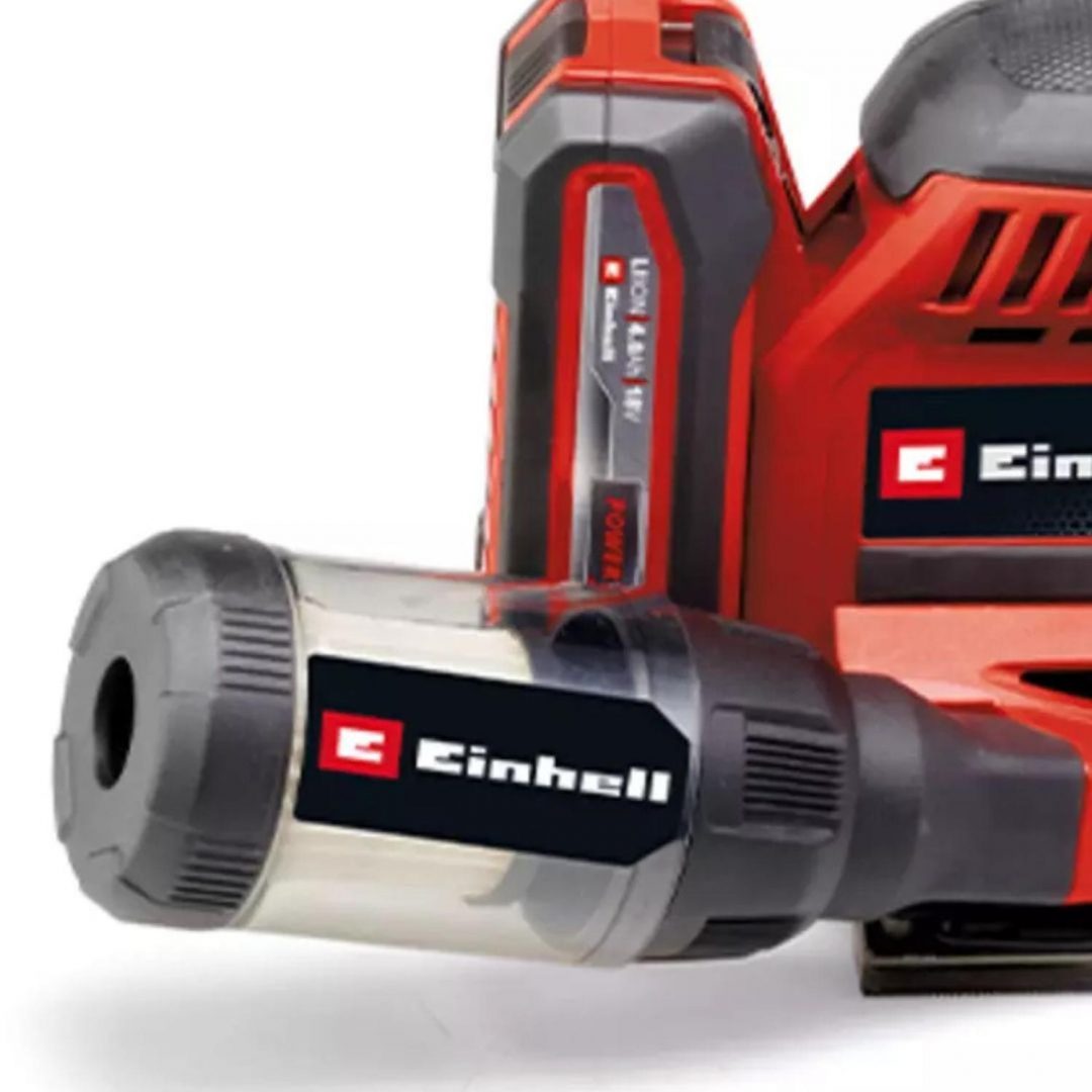 - Para mantener limpia la zona de trabajo, la lijadora orbital tiene un sistema de aspiración integrado con caja colectora de polvo y filtro de pliegues extraíble. Alternativamente, también se puede conectar un sistema de aspiración externo, por ejemplo, un aspirador en seco y húmedo de Einhell, a la conexión de aspiración. El interruptor de encendido y apagado es a prueba de polvo. Su diseño compacto con superficies de agarre suave garantiza un manejo cómodo y una guía óptima de la lijadora orbital. La lijadora de mano a batería TE-OS 18/113 Li-Solo se suministra sin batería ni dispositivo de carga. Estos se pueden adquirir por separado.