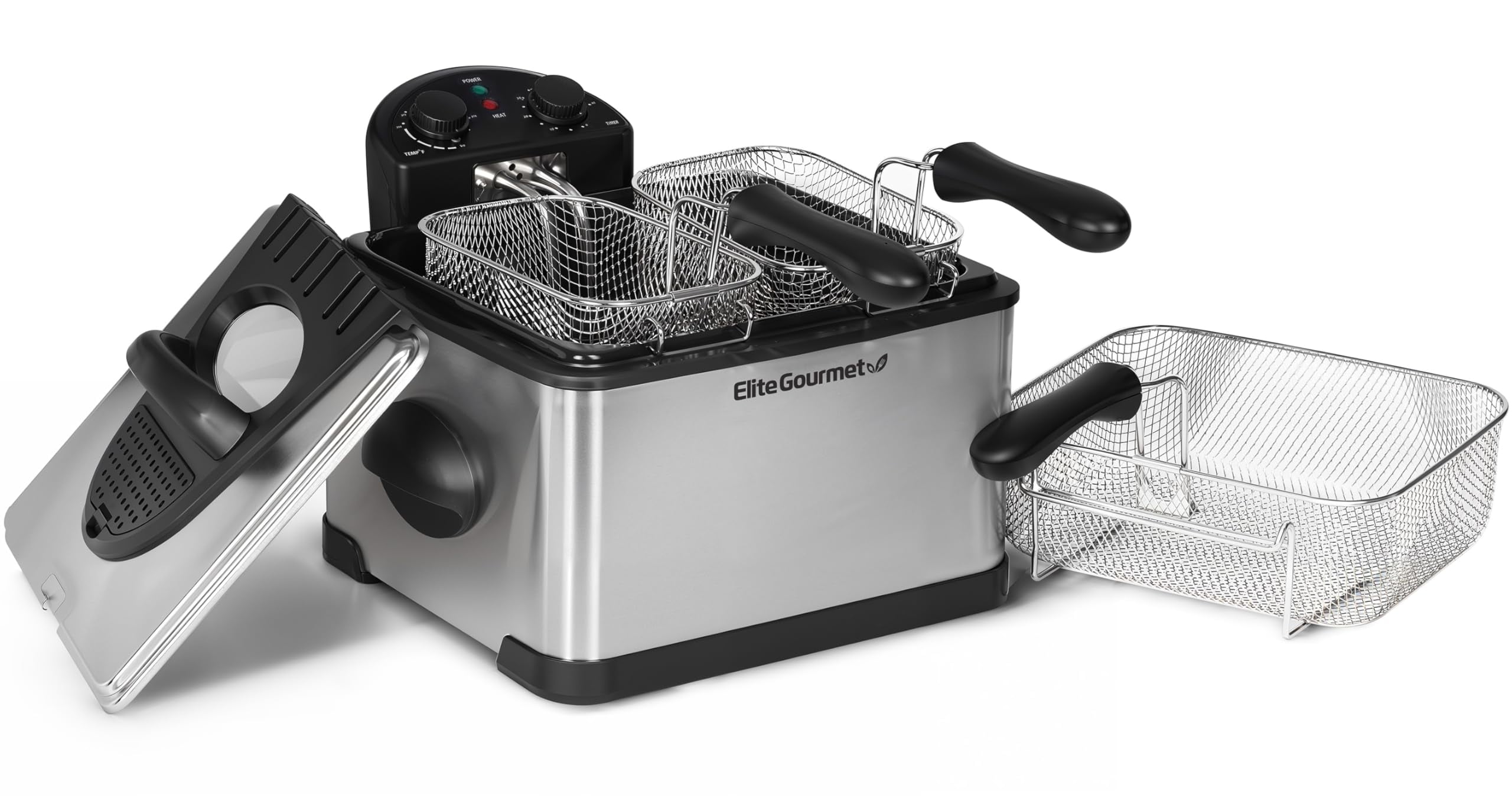 Elite Gourmet EDF-401T Electric 4.5 Qt. / 17 Cup Immersion Deep Fryer 3-Baskets, 1700-Watt, Timer Control Adjustable Temperature, Lid with Viewing Window and Odor Free Filter