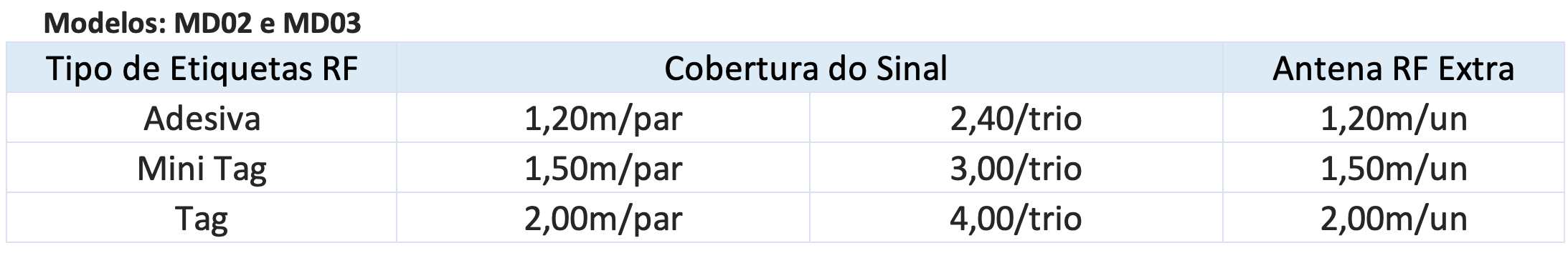 Para o bom funcionamento das Antenas Antifurto RF MD16 é recomendável distância de 1,20m, porém alguns modelos de etiquetas permitem ampliar a distância para até 2,0m. Veja abaixo: