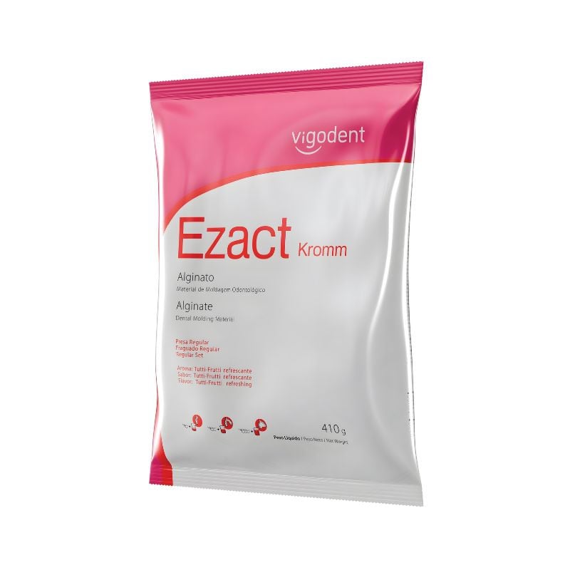 O Alginato Ezact Kromm é um alginato cromático e de presa regular tipo II. Foi desenvolvido para a confecção de modelos de estudos antagonistas, placas de bruxismo, clareamento, próteses totais e parciais removíveis. Conta com alta reprodução de detalhes graças a sua grande compatibilidade com o gesso.