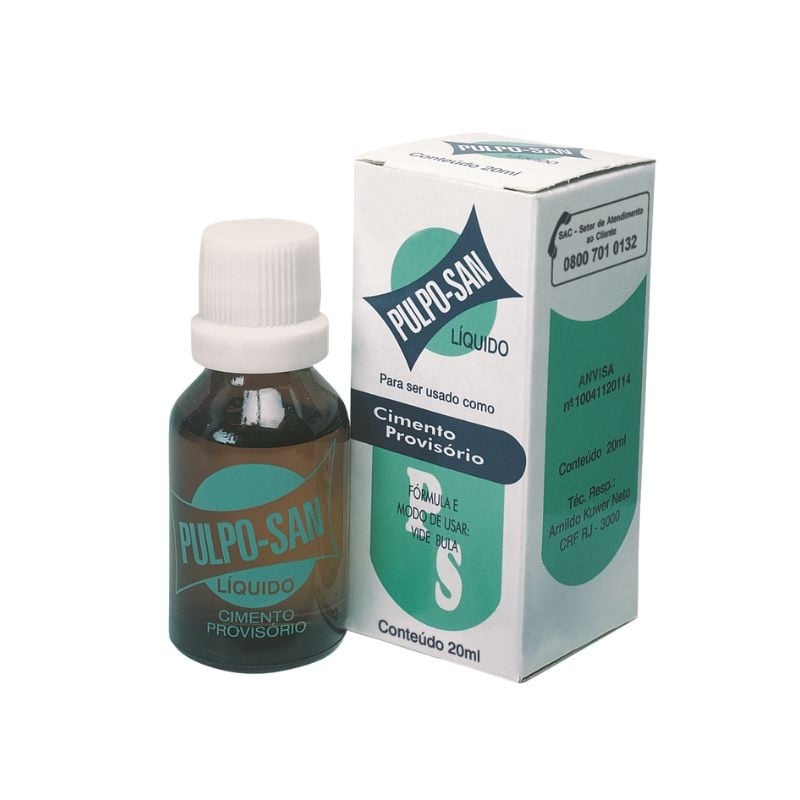 O Cimento Provisório Pulpo-San Líquido conta com ótimas propriedades para oferecer uma solução ideal para restaurações temporárias, sendo seu uso indicado em conjunto com o Cimento Provisório Pulpo-San Pó como base sedativa, forrador de cavidade, curativo selante, cimentação temporária de coroas, pontes, incrustações e obturações temporárias. O Pulpo-San líquido é límpido que apresenta cor levemente amarelada e odor característico predominante do eugenol.