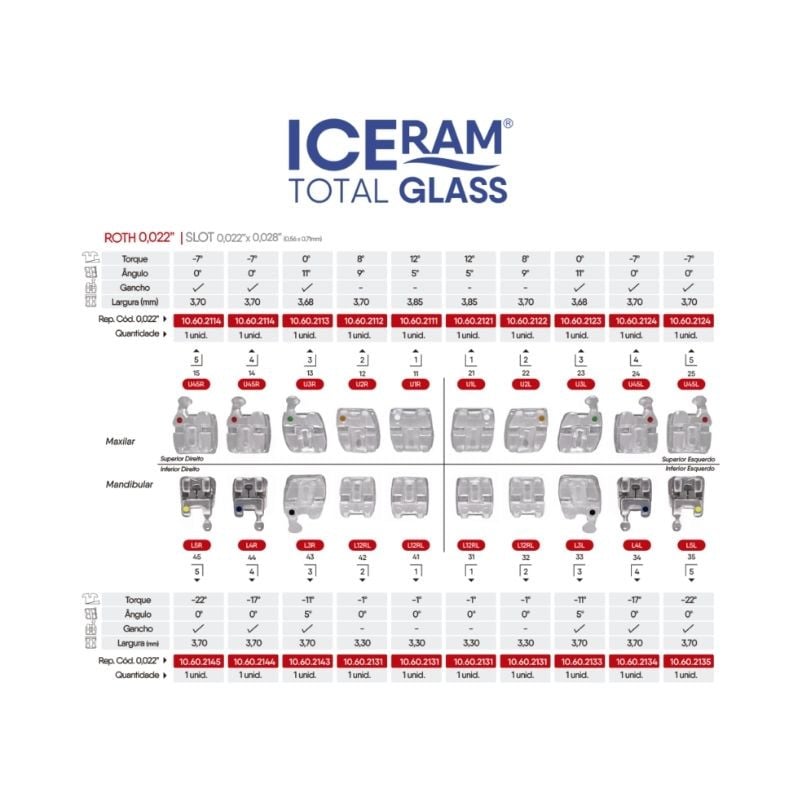 Características do Kit Bráquete Cerâmico Autoligado Iceram Total Glass Roth 022 - Orthometric: