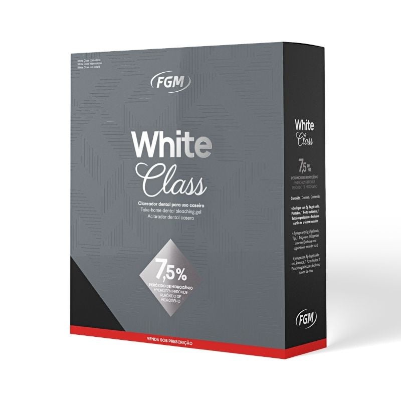 O Kit Clareador White Class 7,5% é indicado para a técnica de clareamento caseiro supervisionado por um cirurgião-dentista. Foi desenvolvido para atender ao público mais exigente, pois conta com menor tempo de uso diário e apresenta resultados mais rápidos quando comparado ao peróxido de carbamida.