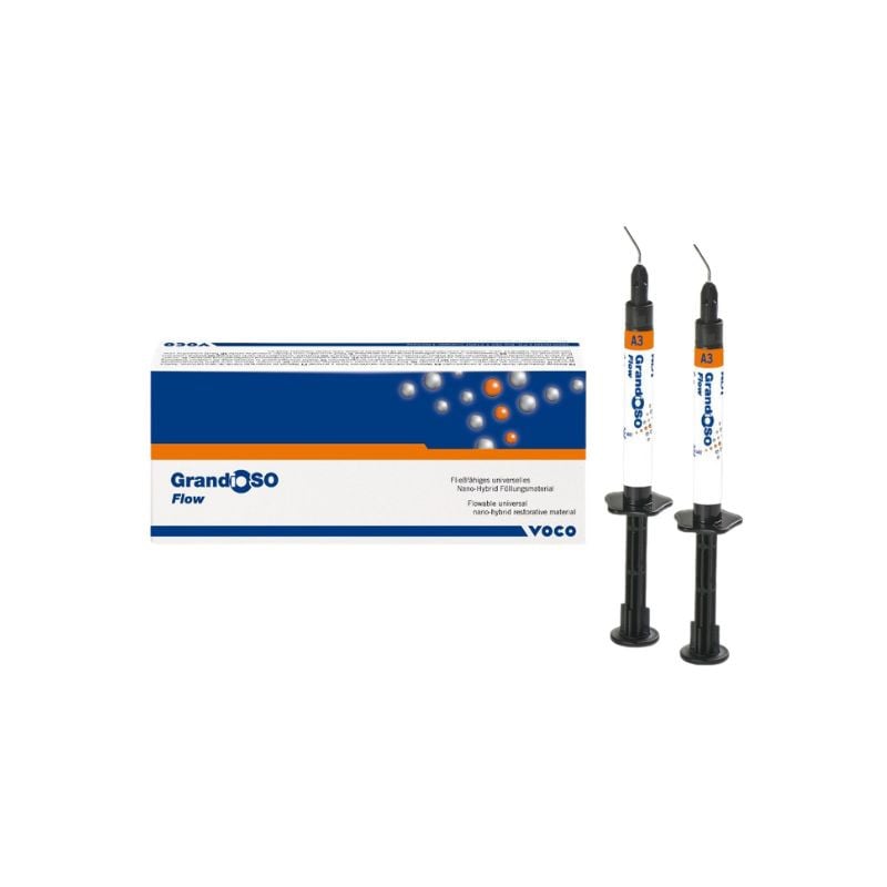 A Resina Grandioso Flow é um compósito de consistência fluida de viscosidade média, nanohíbrida, que conta com ótimas propriedades físicas e mecânicas. Com alta estabilidade de cor, o seu uso é indicado para restaurações de classes I a V, reparação de restaurações e facetas, tratamentos restauradores minimamente invasivos, selamento de fissuras estendidas, bloqueio de áreas retentivas, para base ou forro de cavidades, cimentação de peças protéticas translúcidas (por exemplo as coroas de cerâmica pura), para fixação em bloco e ferulização de dentes (por exemplo com tiras de fibra de vidro) e também como material de base para tiras de fibra de vidro ou similares na confecção de coroas e pontes semipermanentes. Sua ótima fluidez possibilita cobrir por completo as paredes cavitarias, além de ser de uso universal, sendo indicada para cavidades de qualquer classe. Ela também apresenta dureza e resistência à abrasão, alto conteúdo de carga (superior a 80 % p/p) e busca proporcionar ao profissional uma aplicação precisa e segura.