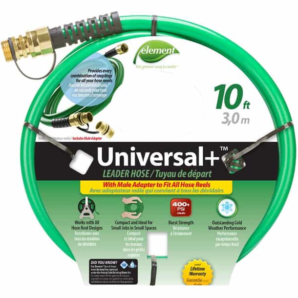 With female couplings on both ends and a male adapter connected to one end, Swan’s Element-brand Universal+® hose provides every coupling combination for all of your garden hose needs. This utility hose is ideal for extending your garden hose, as a connector hose for a hose reel, as a soaker system leader hose and as a dehumidifier drain hose. This 10-ft. universal hose is also excellent for any short-length watering application, so you can water small jobs in small spaces with ease. This heavy-duty universal hose also provides a strong 400+ PSI burst strength, crush-resistant couplings and is constructed of a unique compound for extreme kink-resistance. Swan’s patented Hose Armour® also prevents kinking at the water source.