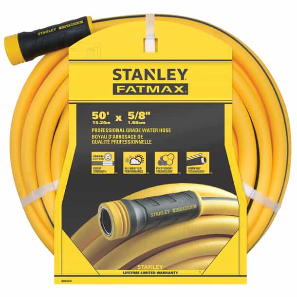 If you need a quality 50' water hose but don't want to deal with the weight of most heavy-duty hoses, try this Fatmax™ Professional Grade Water Hose. Pro-grade performance without the heaviness of a typical rubber hose. The PolyFusion™ technology combines Polyurethane and PVC, making the hose lightweight and easy to work with, while the AntiKink™ technology provides extreme elasticity to keep kinking at a minimum. Another handy feature is the special full-swivel couplings that make tightening or loosening your hose a breeze.