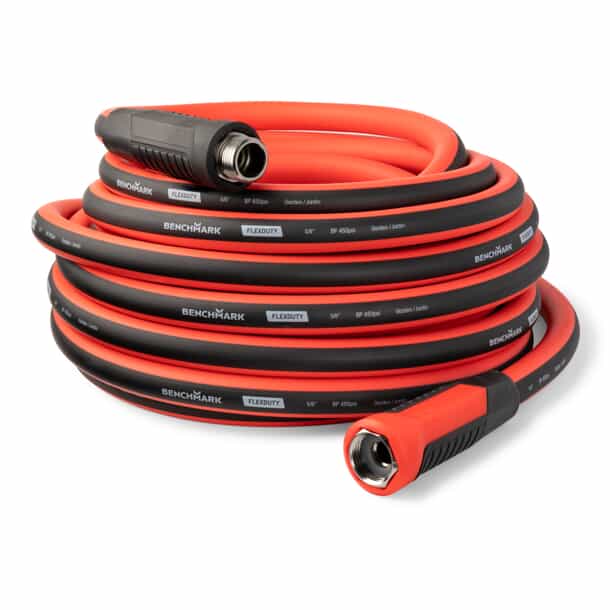 If you need a quality 50' water hose but don't want to deal with the weight of most heavy-duty hoses, try this BENCHMARK Professional Grade Water Hose. Pro-grade performance without the heaviness of a typical rubber hose. The Polyurethane / PVC blend makes this hose lightweight and easy to work with, while the superior kink resistant technology provides extreme elasticity to keep kinking at a minimum. Another handy feature is the special full-swivel couplings that make tightening or loosening your hose a breeze.