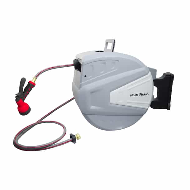 Keep your outdoor space tidy and your gardening routine effortless with this larger 130-foot (39.6 m) Benchmark Wall-Mounted Hose Reel. This innovative storage solution eliminates the frustration of tangled hoses with its smooth automatic retraction system – simply give it a gentle pull when done watering and watch as it neatly rewinds itself without kinks or twists. The built-in glide mechanism ensures perfect winding every time, while the compact wall-mounted design keeps your non-kink hybrid hose concealed yet instantly accessible whenever needed. Unlike bulky traditional reels, this space-saving unit maintains your hose at the ideal working length before seamlessly retracting it for storage, protecting it from damage while keeping your patio or garage clutter-free. Engineered for durability and convenience, the Benchmark reel transforms watering chores into a pleasure, letting you focus on enjoying your vibrant garden rather than wrestling with unruly hoses. With its reliable performance and sleek profile, this hose management system brings order and efficiency to your outdoor space season after season. Neat, tidy, always ready!
